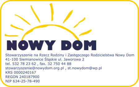 Na terenie Siemianowic Śląskich Stowarzyszenie Nowy Dom od lat realizuje działania na rzecz rodzin zastępczych. Jest to możliwe m.in. dzięki finansowaniu ze środków Urzędu Miasta Siemianowice Śląskie oraz partnerstwu z Miejskim Ośrodkiem Pomocy Społecznej.