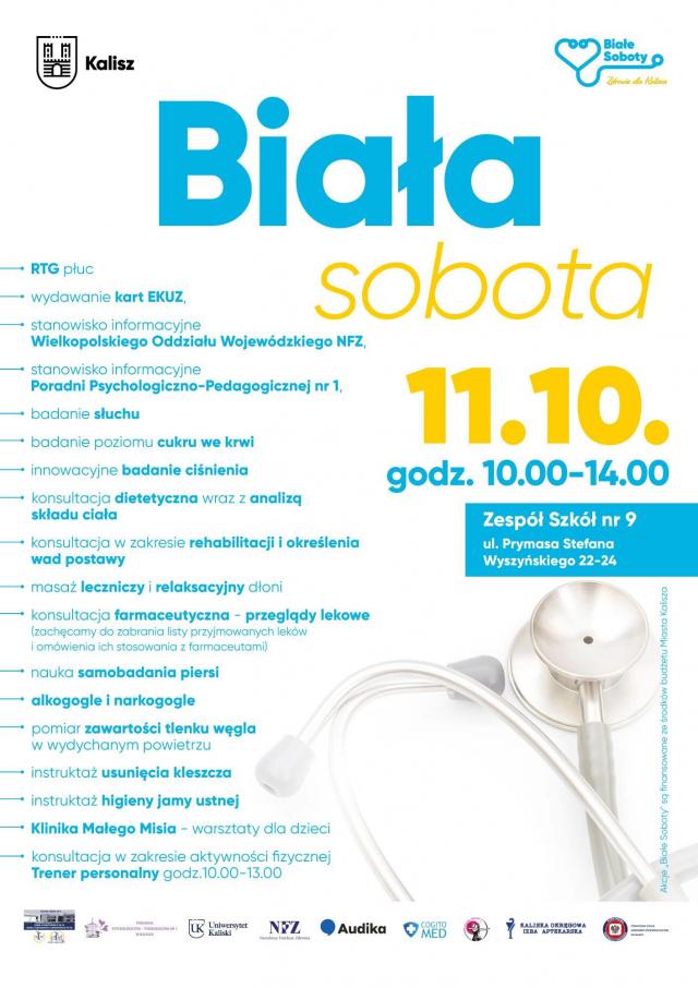 Badania, konsultacje, porady - to wszystko czeka w czasie kolejnej edycji kaliskiego programu profilaktycznego „Biała Sobota" organizowanego przez Miasto Kalisz. Ta odbędzie się w tę sobotę, 11 października na osiedlu Dobrzec. Wszystkie badania przeprowadzane są bezpłatnie, ale na niektóre obowiązuje limit osób.