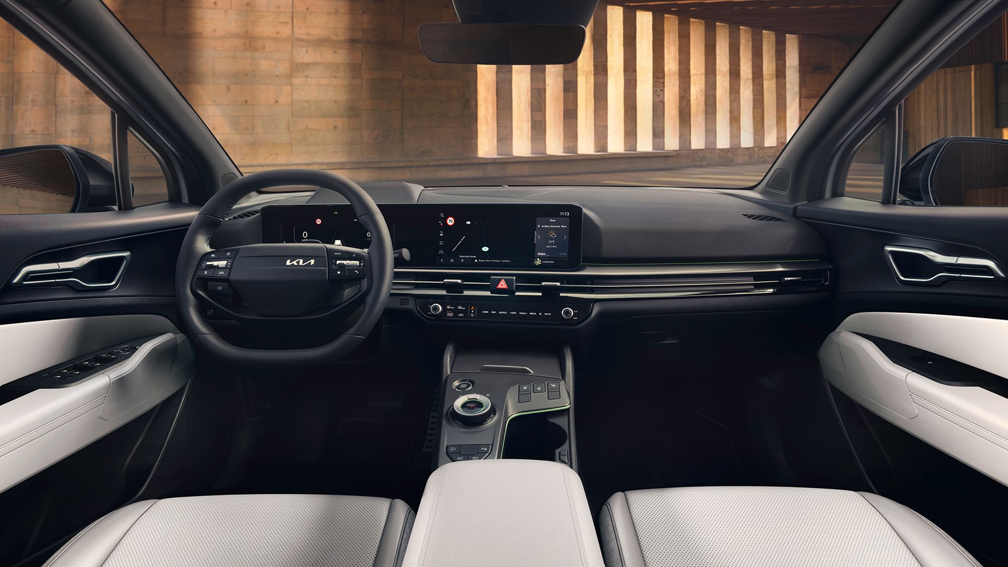 W kabinie pasażerskiej centralne miejsce zajmuje zintegrowany panel dwóch zakrzywionych ekranów. Każdy z nich ma przekątną dokładnie 12,3 cala, co zapewnia doskonałą czytelność zarówno zegarów, jak i systemu multimedialnego.