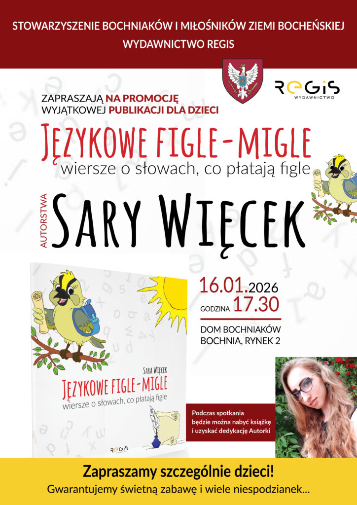 Na 16 stycznia w Domu Bochniaków zaplanowano promocję książki dla dzieci „Językowe figle-migle” autorstwa Sary Więcek. Organizatorami wydarzenia są: Stowarzyszenie Bochniaków i Miłośników Ziemi Bocheńskiej oraz Wydawnictwo „Regis”, które wydało książkę. Spotkanie rozpocznie się o godz. 17.30.