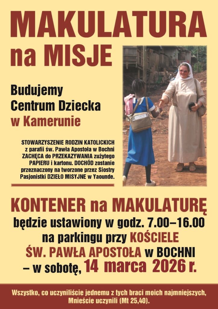 Stowarzyszenie Rodzin Katolickich przy parafii św. Pawła Ap. rozpoczyna 13. rok akcji „Makulatura na misje”. Pierwsza w tym roku zbiórka odbędzie się w sobotę 14 marca przy kościele św. Pawła Ap. w Bochni.Kontener na makulaturę będzie ustawiony w godz. 7.00 -16.00.
