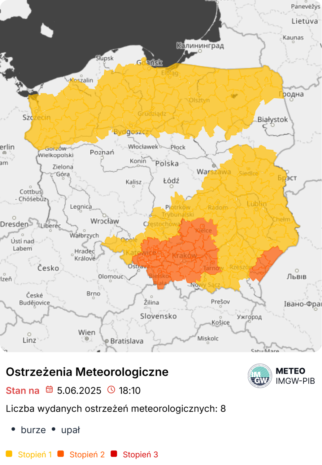 Ostrzeżenie I stopnia przewiduje warunki sprzyjające wystąpieniu niebezpiecznych zjawisk meteorologicznych mogących powodować straty materialne oraz zagrożenie zdrowia i życia. Instytut zaleca ostrożność i śledzenie komunikatów o rozwoju sytuacji pogodowej.
