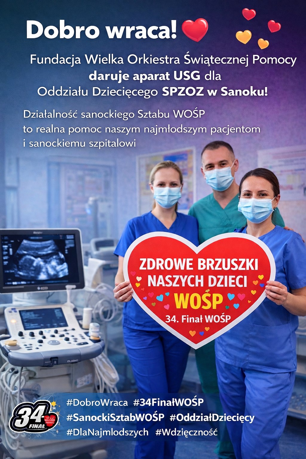 Oddział Dziecięcy SPZOZ w Sanoku otrzyma nowoczesny sprzęt diagnostyczny. W ramach zakończonego 34. Finału WOŚP „Zdrowe brzuszki naszych dzieci”, Zarząd Fundacji wyraził zgodę na zakup aparatu USG klasy premium dla sanockiej placówki.