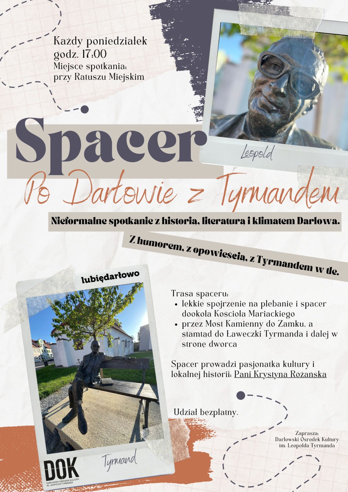 Zapraszamy w każdy poniedziałek tego lata do udziału w bezpłatnych wycieczkach po Darłowie. W podróż tę zabierze Państwa licencjonowany przewodnik, na co dzień radna Rady Miejskiej w Darłowie i inicjatorka powstania pierwszej w Polsce ławeczki Leopolda Tyrmanda – Pani Krystyna Różańska.