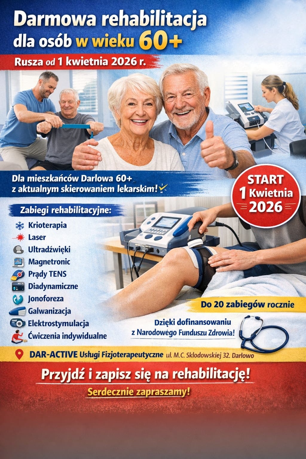 Serdecznie zapraszamy mieszkańców miasta w wieku 60 + do skorzystania z darmowej i kompleksowej rehabilitacji !Przyjdź i zapisz się na zabiegi rehabilitacyjne.