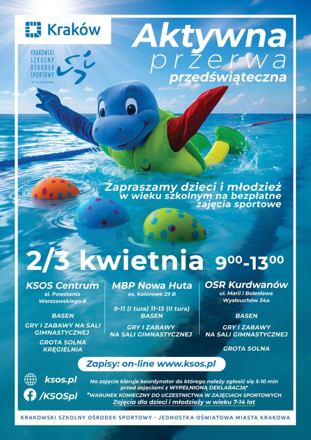 Krakowski Szkolny Ośrodek Sportowy przygotował bezpłatne zajęcia dla dzieci i młodzieży, które odbędą się 2 i 3 kwietnia w trzech lokalizacjach na terenie miasta.