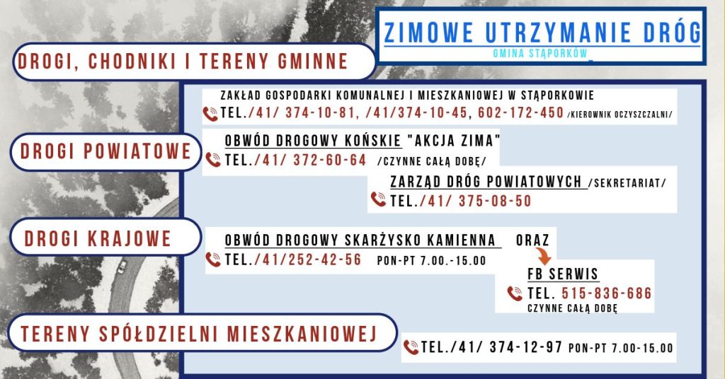 Do stanu dróg odniosła się także gmina Stąporków, treść jest dokładnie taka sama jak powyżej. Dodatkowo ten samorząd opublikował numery kontaktowe do jednostek odpowiedzialnych za utrzymanie odpowiedniego stanu dróg i chodników. Szczegóły znajdziecie na grafice poniżej: