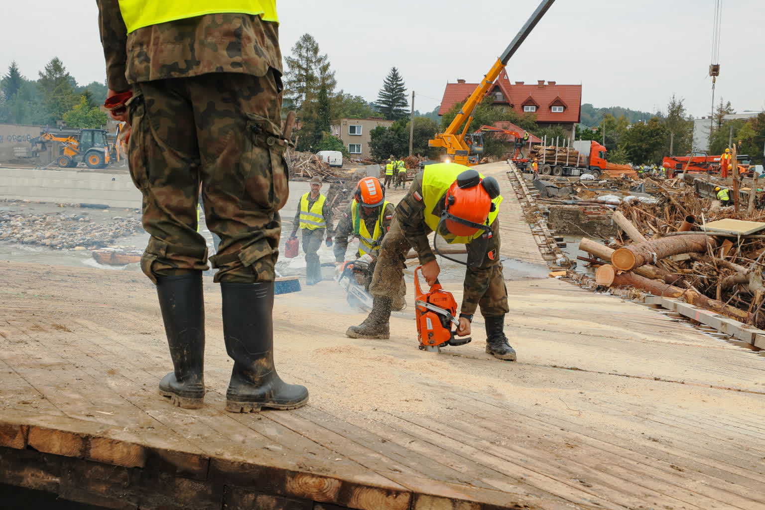 Od wczoraj trwa sprzątanie brzegu Białej Głuchołaskiej, w miejscu, gdzie woda zniszczyła dwa mosty – tymczasowy i budowany. W tym miejscu ma pojawić się most wybudowany przez żołnierzy.