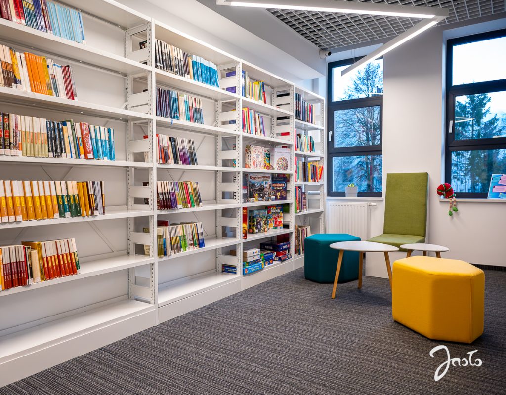 Nowa biblioteka w Jaśle została zaprojektowana z myślą o różnych grupach użytkowników. Od wejścia dostępny jest przestronny hol z półkami nowości wydawniczych oraz bogatym wyborem czasopism. Wydzielono strefę dla dorosłych, osobną, przytulną przestrzeń dla dzieci oraz niezależną strefę młodzieżową wyposażoną w książki, komputery, planszówki i miejsca do odpoczynku.