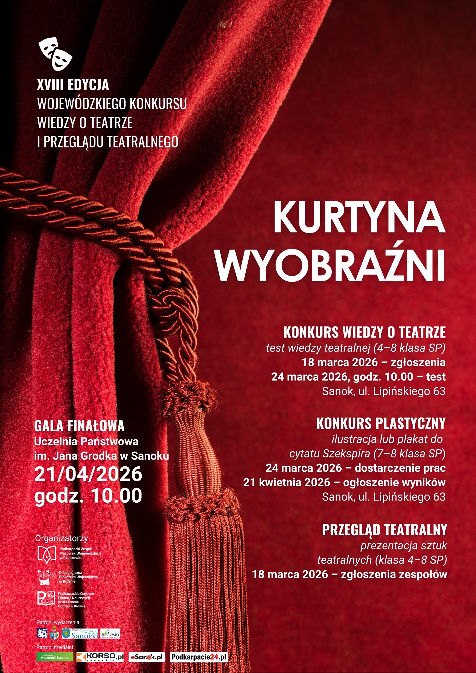 Już w najbliższy wtorek, 21 kwietnia o godzinie 10:00 w murach Uczelni Państwowej w Sanoku odbędzie się uroczysta Gala Finałowa XVIII edycji Wojewódzkiego Konkursu Wiedzy o Teatrze i Przeglądu Teatralnego „Kurtyna Wyobraźni”. Podczas wydarzenia poznamy również mistrzów ortografii. Zapraszamy do zapoznania się ze szczegółami.