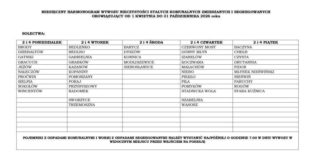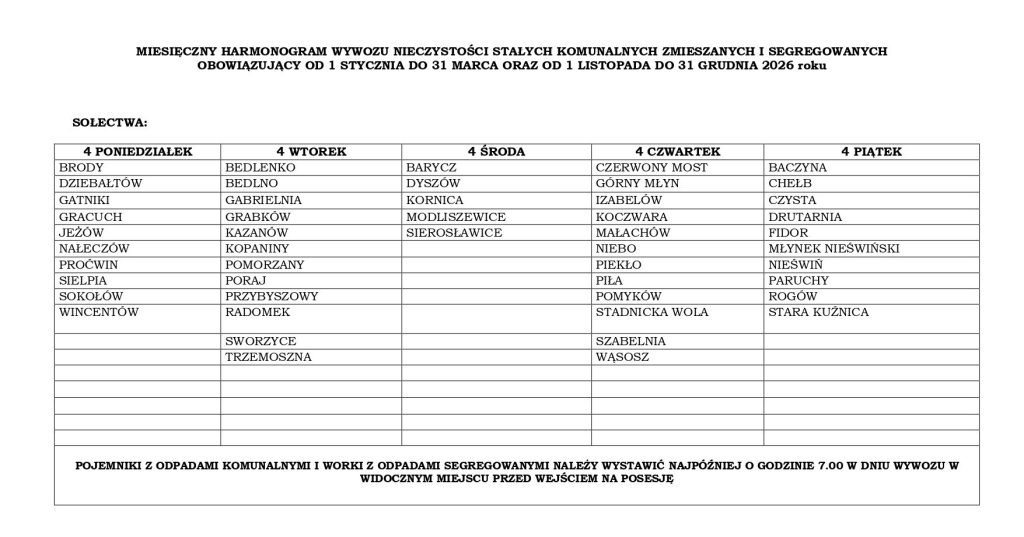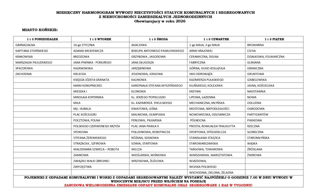 Urząd Miasta i Gminy Końskie opublikował harmonogram wywozu odpadów na terenie miasta oraz gminnych sołectw na 2026 rok. Poniżej publikujemy tabele ze szczegółowymi terminarzami.