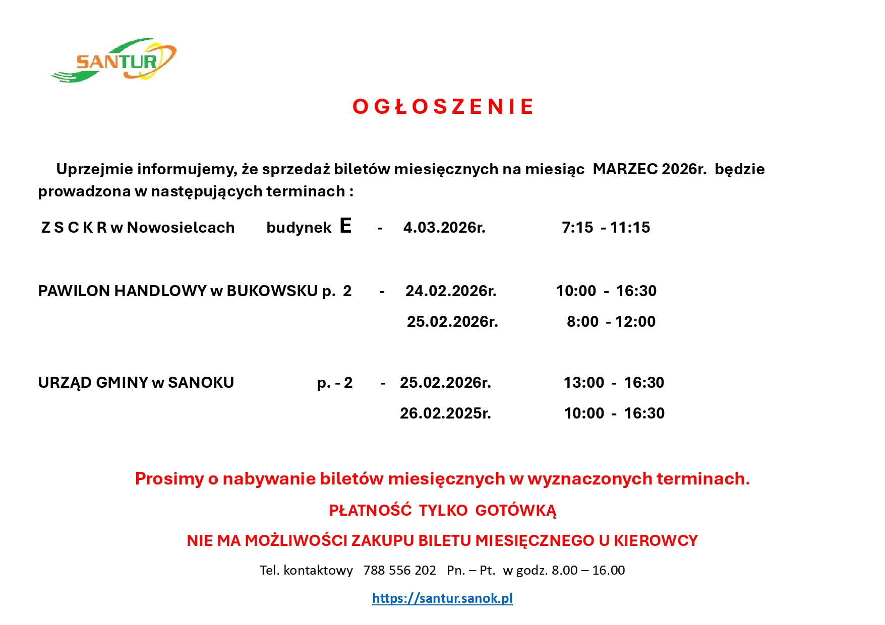 Przewoźnik SANTUR Sp. z o.o. ogłasza harmonogram sprzedaży biletów miesięcznych na marzec 2026 r. dla pasażerów korzystających z usług przewozowych. Zarząd spółki apeluje o zakup biletów wyłącznie w wyznaczonych miejscach i terminach.