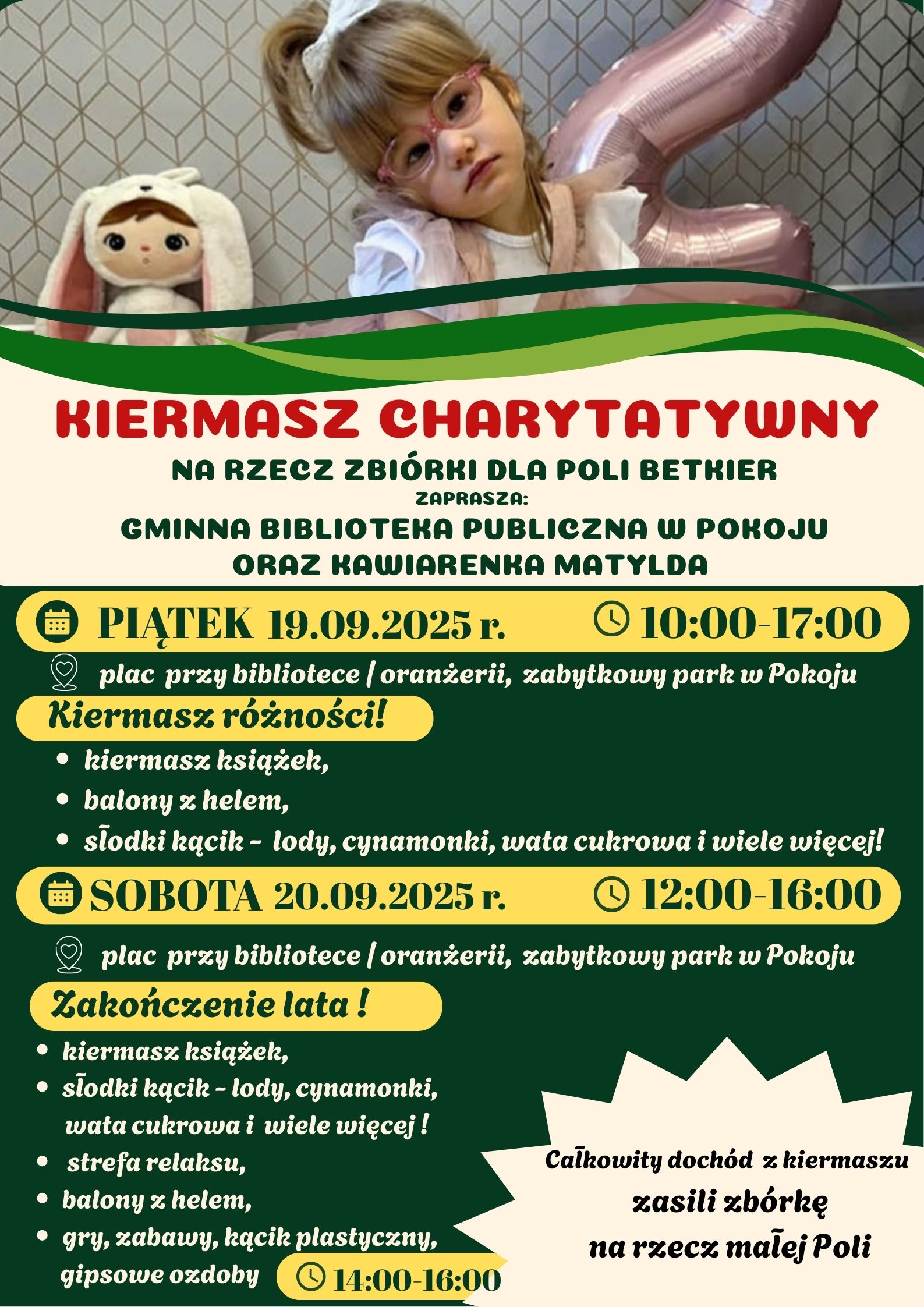 W piątek (19 września) i sobotę (20 września) zapraszamy na wyjątkowe spotkania pełne smaku, zabawy i dobra. Gminna Biblioteka Publiczna w Pokoju i Kawiarenka Matylda organizują kiermasz, z którego całkowity dochód przeznaczony będzie na wsparcie zbiórki dla Poli Betkier.