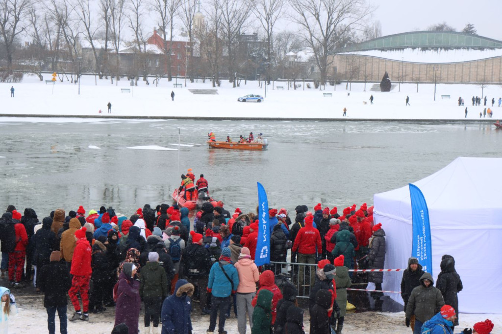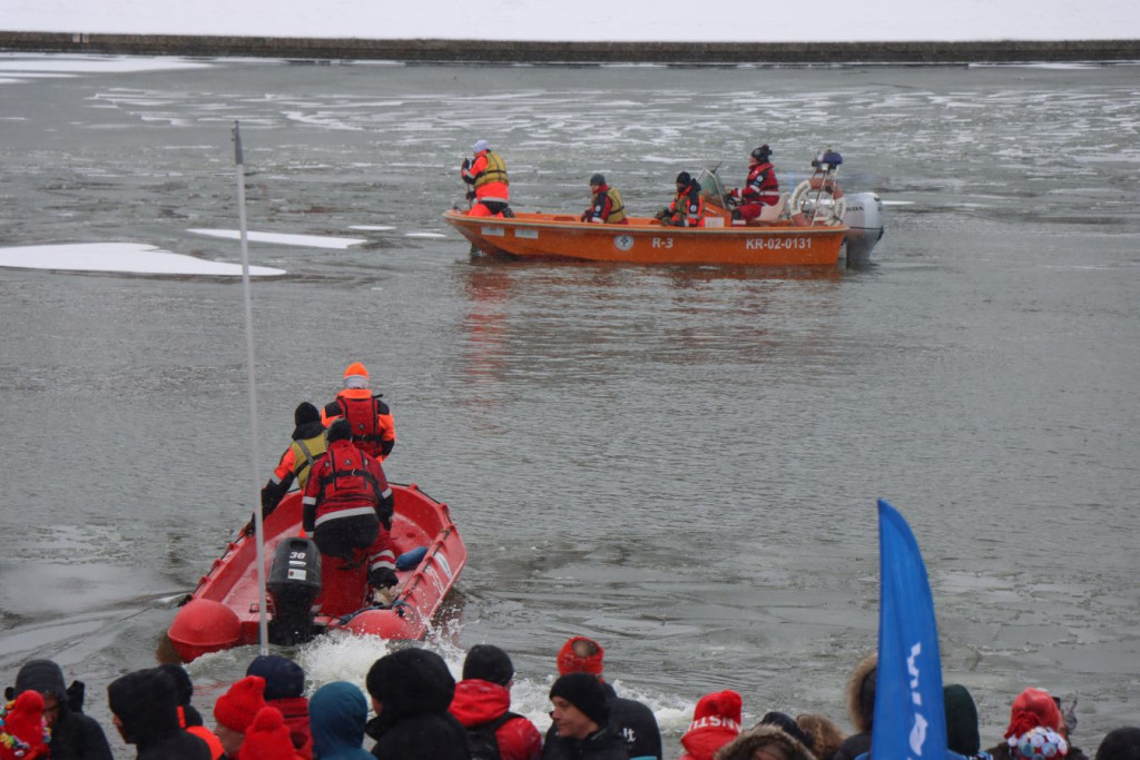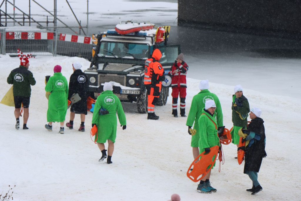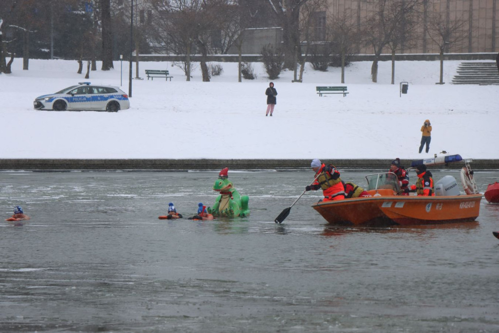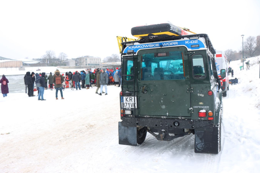 Zanim pierwsi uczestnicy weszli do wody, do pracy przystąpili ratownicy krakowskiego WOPR. W zimowych warunkach najważniejsze było przygotowanie bezpiecznego „korytarza” – motorówki patrolowały trasę, rozbijając mniejsze tafle lodu i odsuwając płynącą krę, by nie zagrażała osobom w wodzie.