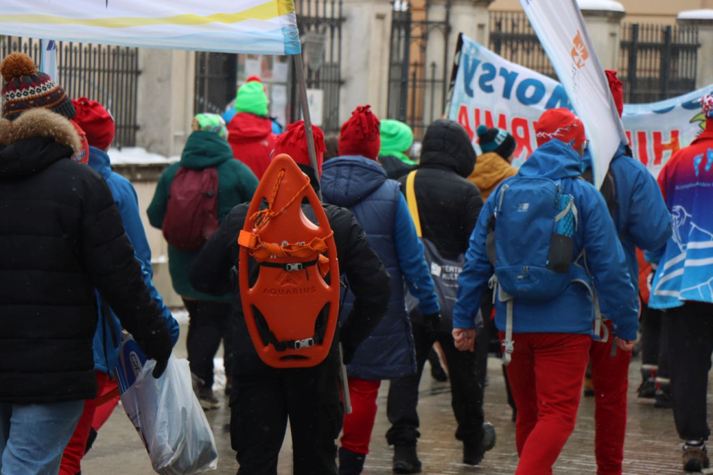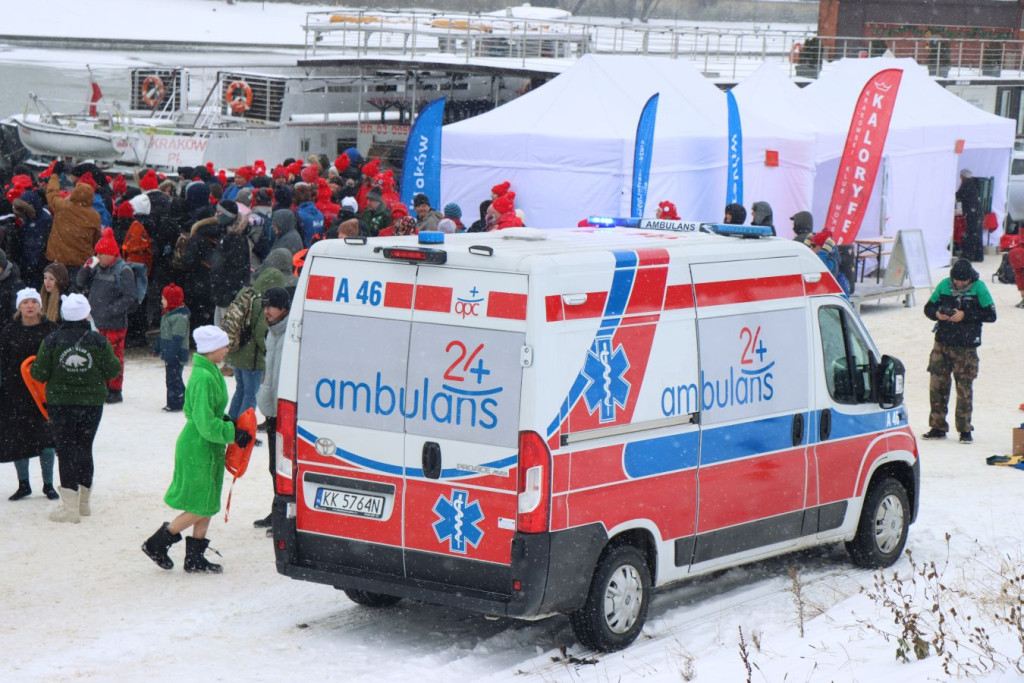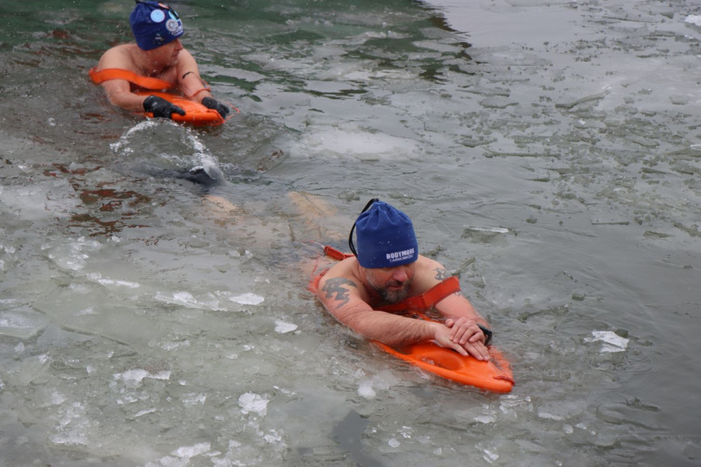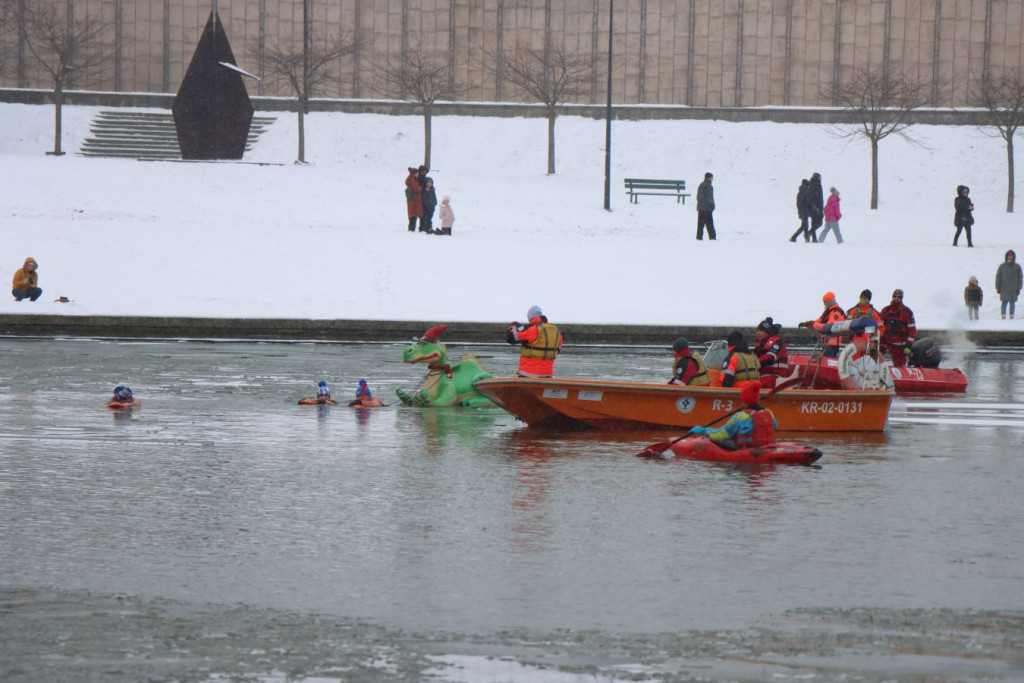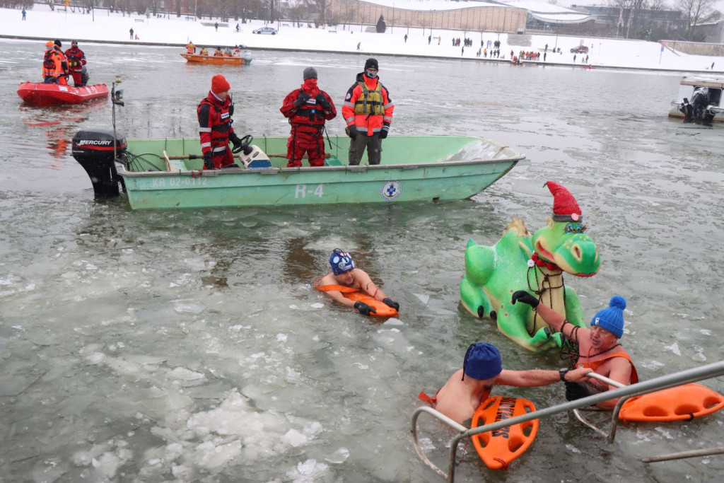 Zanim pierwsi uczestnicy weszli do wody, do pracy przystąpili ratownicy krakowskiego WOPR. W zimowych warunkach najważniejsze było przygotowanie bezpiecznego „korytarza” – motorówki patrolowały trasę, rozbijając mniejsze tafle lodu i odsuwając płynącą krę, by nie zagrażała osobom w wodzie.
