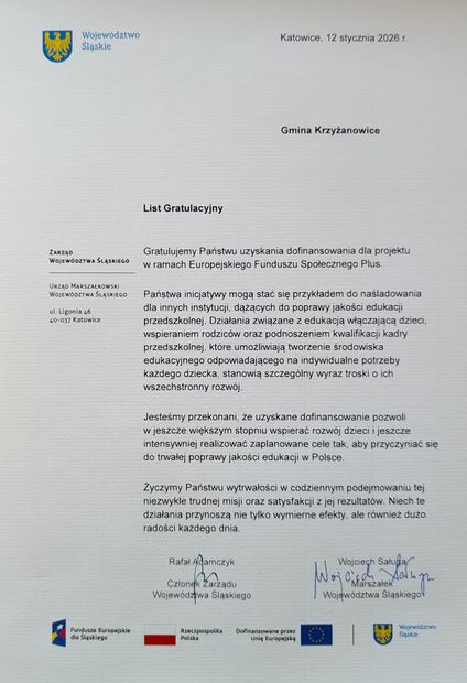 W Sali Marmurowej Urzędu Marszałkowskiego wręczono dziś listy gratulacyjne samorządom, które otrzymały wsparcie finansowe na realizację projektów edukacyjnych dla przedszkoli. Wśród wyróżnionych znalazła się gmina Krzyżanowice. Samorząd reprezentowali zastępca wójta Wolfgang Kroczek oraz dyrektor Przedszkola w Bieńkowicach Barbara Somerla, działający w imieniu wójta Grzegorza Utrackiego.