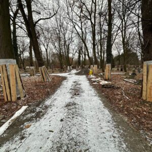 Chodzi o odtworzenie cmentarnych alejek. Z czasem na miejscu mają się też pojawić nowe ławki. Ale na tym nie koniec. Przestrzeń ma też zyskać nowy blask. Dosłownie – w ziemi widać bowiem już elementy infrastruktury potrzebnej do montażu latarni przy alejkach. Od strony ulicy Niemodlińskiej ma też powstać nowe wejście na teren nekropolii.