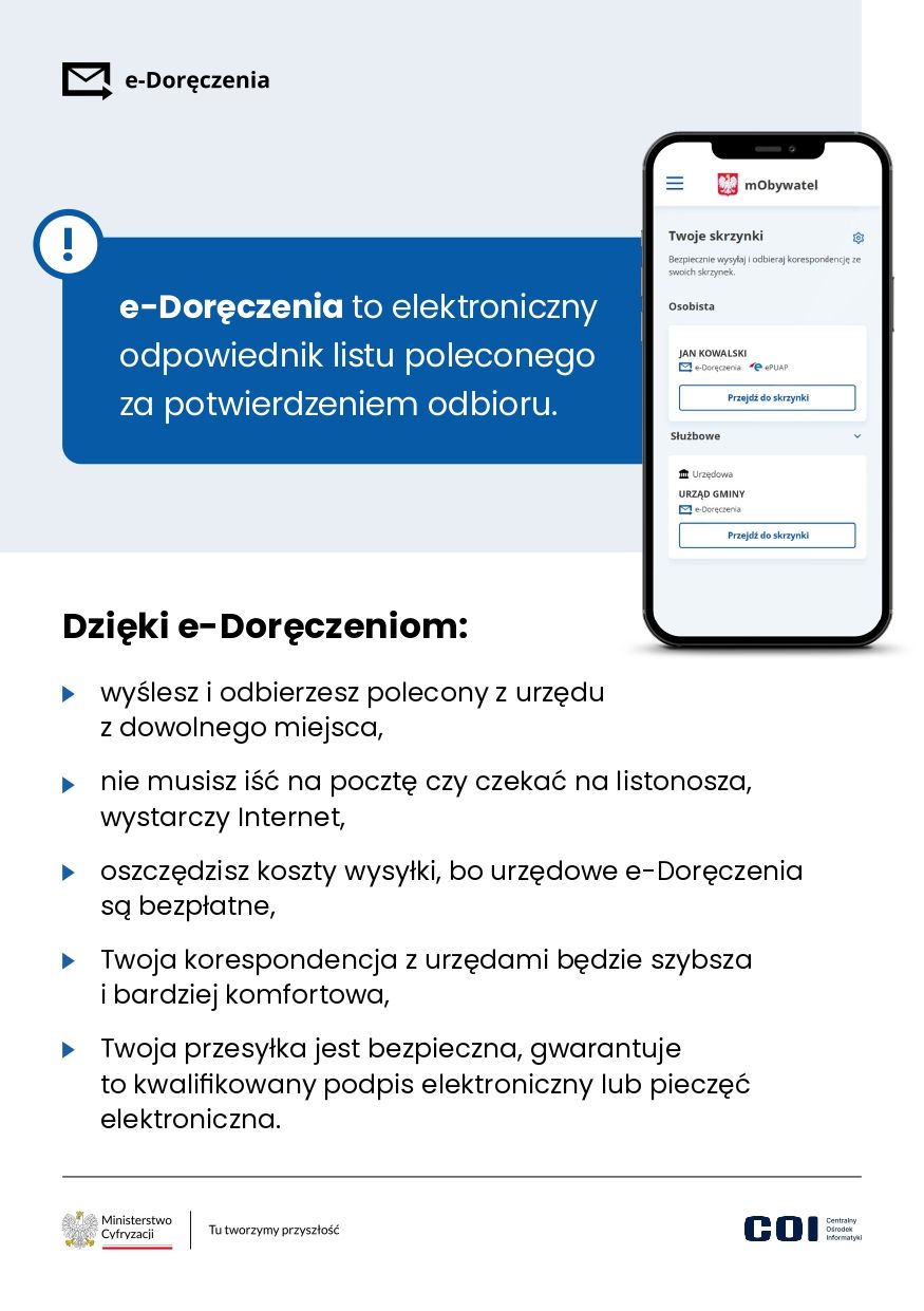 - Odbierasz urzędową korespondencję online — bez awizo i oczekiwania na listonosza.
