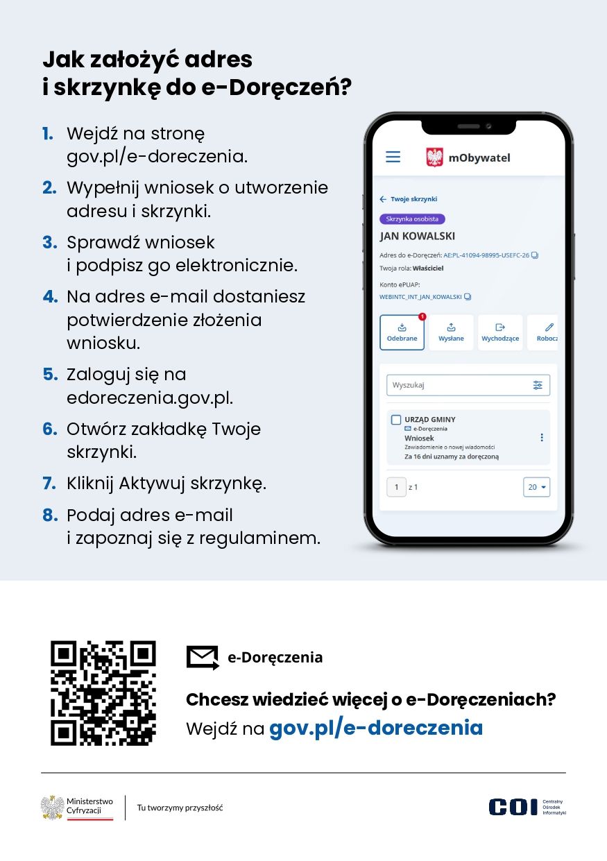 Chcesz łatwiej, szybciej i bezpieczniej załatwiać sprawy urzędowe? Teraz możesz odbierać korespondencję urzędową elektronicznie — bez kolejek, awizo i pójścia na pocztę! Załóż skrzyneczkę e-Doręczeń i korzystaj z usług publicznych online wygodnie ze telefona, tabletu czy komputera!