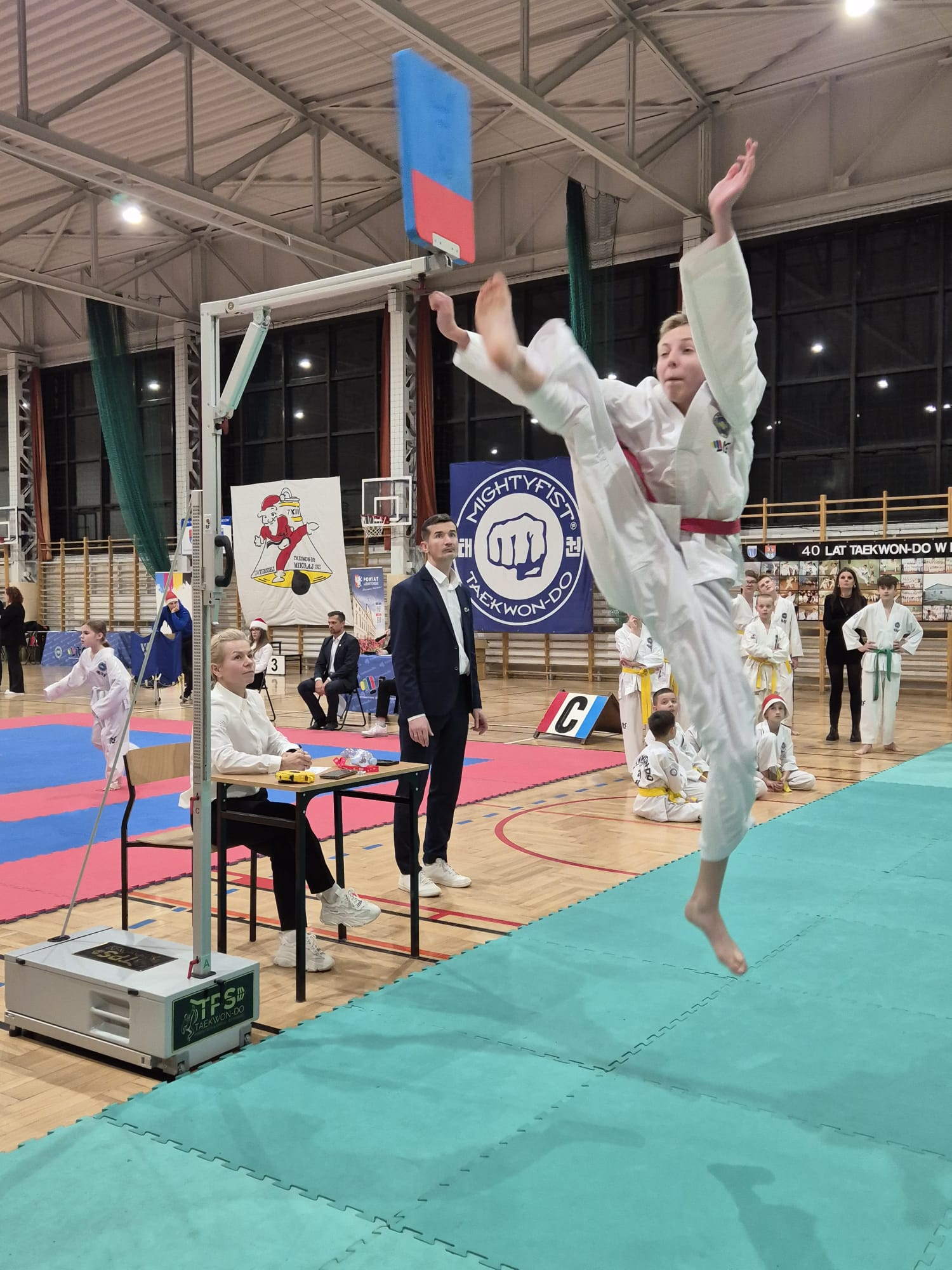 Rywalizację jak już jest w tradycji mikołajkowej, rozpoczęli najmłodsi uczestnicy zajęć, czyli „Tygryski”. Każdy z tych młodych wojowników musiał pokonać trudny i długi tor przeszkód, na końcu którego po wykonaniu specjalnego rozbicia ręką otrzymywał od Mikołaja paczkę ze słodyczami, medal oraz bidon z logo „Tygrysków”.