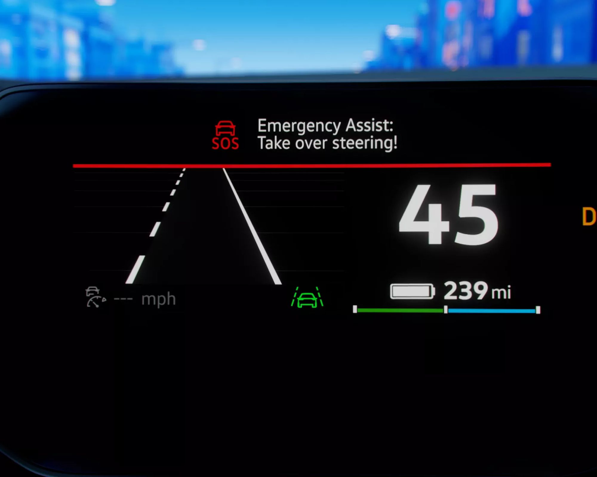 Faza 1: ostrzeganie i weryfikacja. Gdy system wykryje brak rąk na kierownicy, zaczyna delikatnie. Na Digital Cockpit pojawia się biały, a potem czerwony komunikat nakłaniający kierowcę do przejęcia kontroli nad pojazdem, wsparty narastającym sygnałem akustycznym.
