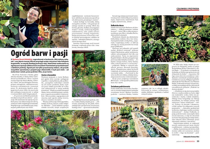 U Barbary Kocot-Kołodziej, nagrodzonej w konkursie „Mój zielony zakątek”, czas płynie inaczej. Wzrok przyciąga wciąż o tej porze roku fuksjowa bugenwilla, na zmysły działają pachnące róże, elementem zaskoczenia są egzotyczne opuncje udekorowane muszlami i kamieniami przywiezionymi z dalekich podróży. Ogród Basi jest nie tylko przestrzenią relaksu, ale przede wszystkim opowieścią o pasjach jego właścicielki. A tych jest wiele – od malarstwa i sztuki, przez podróże i film, aż po taniec.