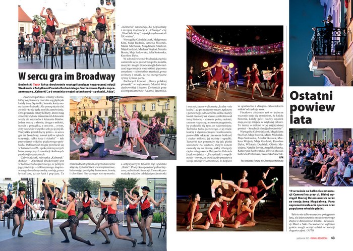 Bocheński Teatr Tańca dwukrotnie wystąpił podczas 18. edycji Weekendu z Zabytkami Powiatu Bocheńskiego. 5 września na płycie bocheńskiego Rynku zaprezentowano spektakl „Kelnerki”, a dzień później w tężni solankowej – „Róża”. W artykule zatytułowanym „W sercu gra im Broadway” nie brakuje pełnej obsady spektakli.