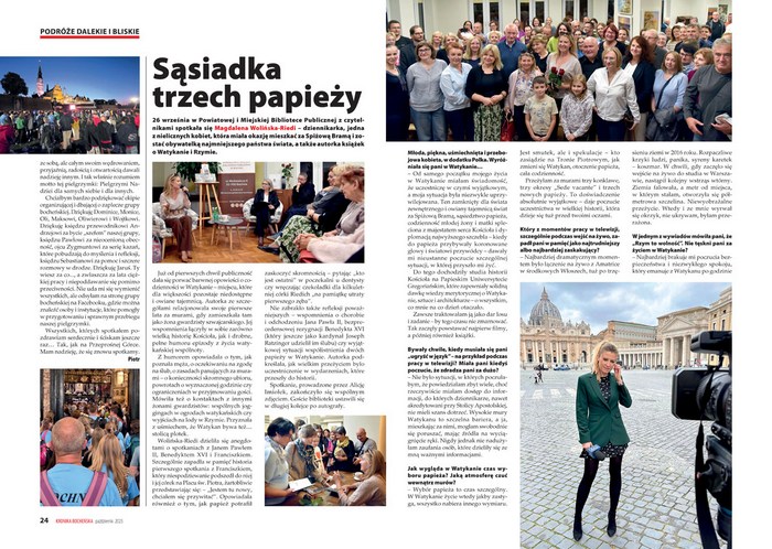 – „Od samego początku mojego życia w Watykanie miałam świadomość, iż uczestniczę w czymś wyjątkowym, a moja sytuacja była niezwykle uprzywilejowana. Ten zamknięty dla świata zewnętrznego i owiany tajemnicą świat za Spiżową Bramą, sąsiedztwo papieża, codzienność młodej żony i matki spleciona z majestatem serca Kościoła i dyplomacją najwyższego szczebla – kiedy do papieża przybywały koronowane głowy i światowi przywódcy – dawały mi nieustanne poczucie szczególnej sytuacji, w której przyszło mi żyć” – mówi Magdalena Wolińska-Riedi, dziennikarka, która we wrześniu odwiedziła bocheńską bibliotekę, a po spotkaniu udzieliła „Kronice” krótkiego wywiadu.
