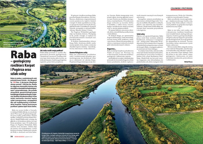 – „Raba jest znakomitym przykładem rzeki o zróżnicowanej dynamice geomorfologicznej” – co to znaczy? Wyjaśnia geolog Michał Flasza. Przypomina też, iż Raba przez wieki była ważnym szlakiem handlowym, zwłaszcza w transporcie soli, „białego złota”. Tekst ilustrują zachwycające zdjęcia rzeki z lotu ptaka.