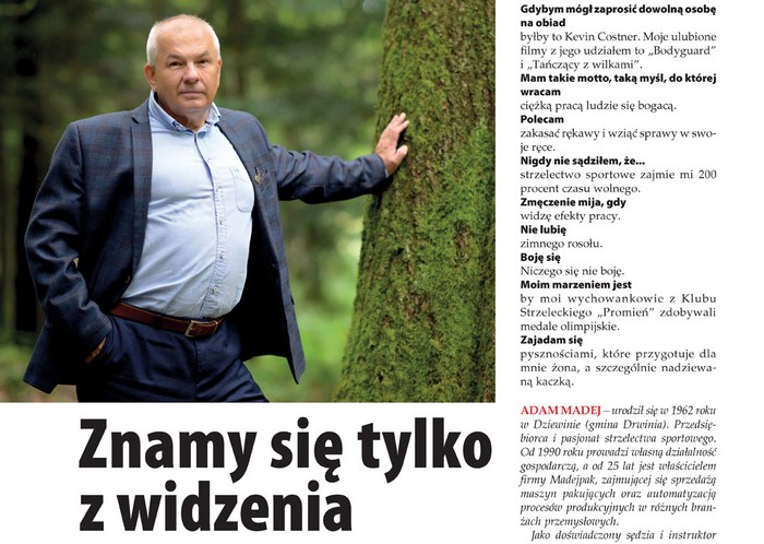 Bohaterem działu „Znamy się tylko z widzenia” jest Adam Madej, przedsiębiorca i miłośnika strzelectwa sportowego. Wolny czas najchętniej spędza z młodzieżą w bocheńskiej strzelnicy, jest prezesem TKKF „Promień”.
