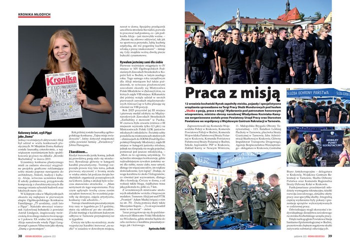 – „To taniec o miłości w jej najczystszej postaci – kruchej i silnej jednocześnie” – tak o spektaklu tanecznym „Róża” mówi jego reżyserka Gabriela Jacak. Zdjęcie z wrześniowego występu Bocheńskiego Teatru Tańca w tężni solankowej trafiło na okładkę październikowego wydania „Kroniki Bocheńskiej”. W tym numerze przeczytać można między innymi wywiady ze znaną dziennikarką Magdaleną Wolińską-Riedi czy ekstraklasową koszykarką Britney Jones. Prezentacja pierwszoklasistów uczęszczających do bocheńskich podstawówek rozpoczyna się od uczniów SP nr 1 i SP nr 2, a na zajmującej prawie całą rozkładówkę fotografii znalazło się 340 pierwszaków I LO.