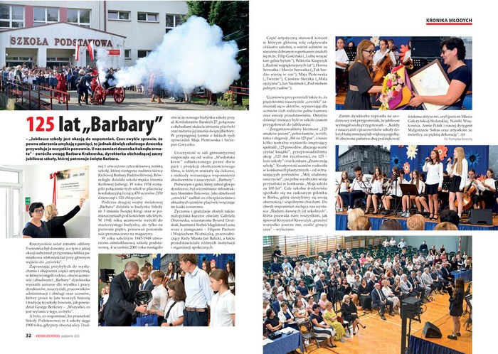 – „Jubileusz szkoły jest okazją do wspomnień. Czas zwykle sprawia, iż pewne zdarzenia umykają z pamięci, to jednak dźwięk szkolnego dzwonka przywołuje je wszystkie ponownie. U nas zamiast dzwonka huknęła armata” – zwróciła uwagę Barbara Krakowska, dyrektorka obchodzącej zacny jubileusz szkoły, której patronuje święta Barbara. Miesięcznik zamieszcza zdjęcia i relację z tego wydarzenia.