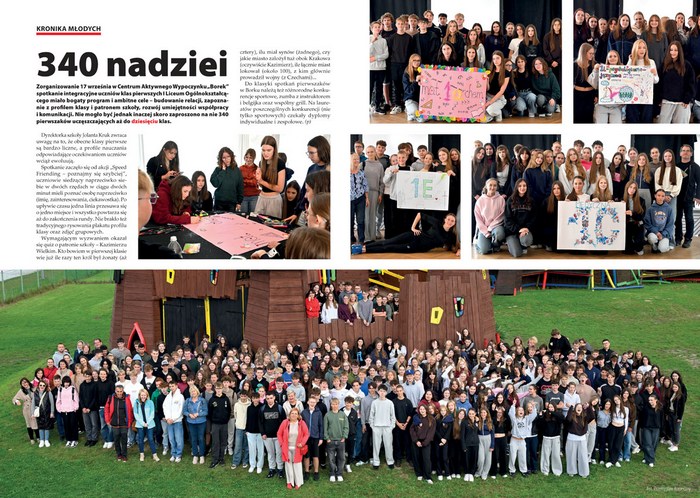 Zorganizowane 17 września w Centrum Aktywnego Wypoczynku „Borek” spotkanie integracyjne uczniów klas pierwszych I Liceum Ogólnokształcącego miało bogaty program i ambitne cele- budowanie relacji, zapoznanie z profilem klasy, rozwój umiejętności współpracy i komunikacji. Zaproszono 340 pierwszaków uczęszczających aż do 10 klas. Wszyscy uczestnicy spotkania odnajdą się na zdjęciu zbiorowym.