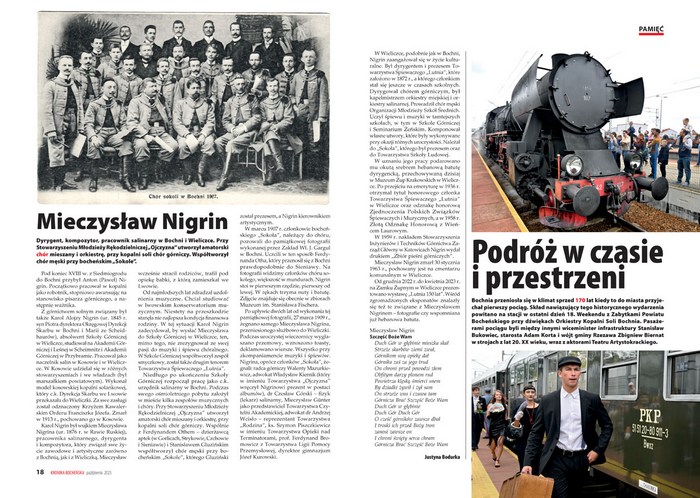 Justyna Bodurka przypomina postać Mieczysława Nigrima, dyrygenta, kompozytora, pracownika salinarnego w Bochni i Wieliczce. Przy Stowarzyszeniu Młodzieży Rękodzielniczej „Ojczyzna” utworzył amatorski chór mieszany i orkiestrę, przy kopalni soli chór górniczy. Współtworzył chór męski przy bocheńskim „Sokole”.