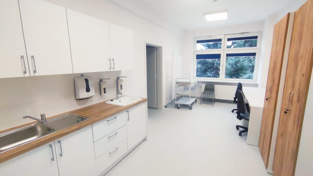 W ramach inwestycji przebudowano wnętrza bloku „D”, wymieniono instalacje sanitarne, elektryczne, teletechniczne i przeciwpożarowe oraz wykonano nowoczesne wykończenia. Wybudowano również szyb windowy z przedsionkiem, co znacząco poprawiło dostępność poradni – szczególnie dla osób starszych i z ograniczoną mobilnością. Zmodernizowano także otoczenie budynku, usprawniając ciągi komunikacyjne.