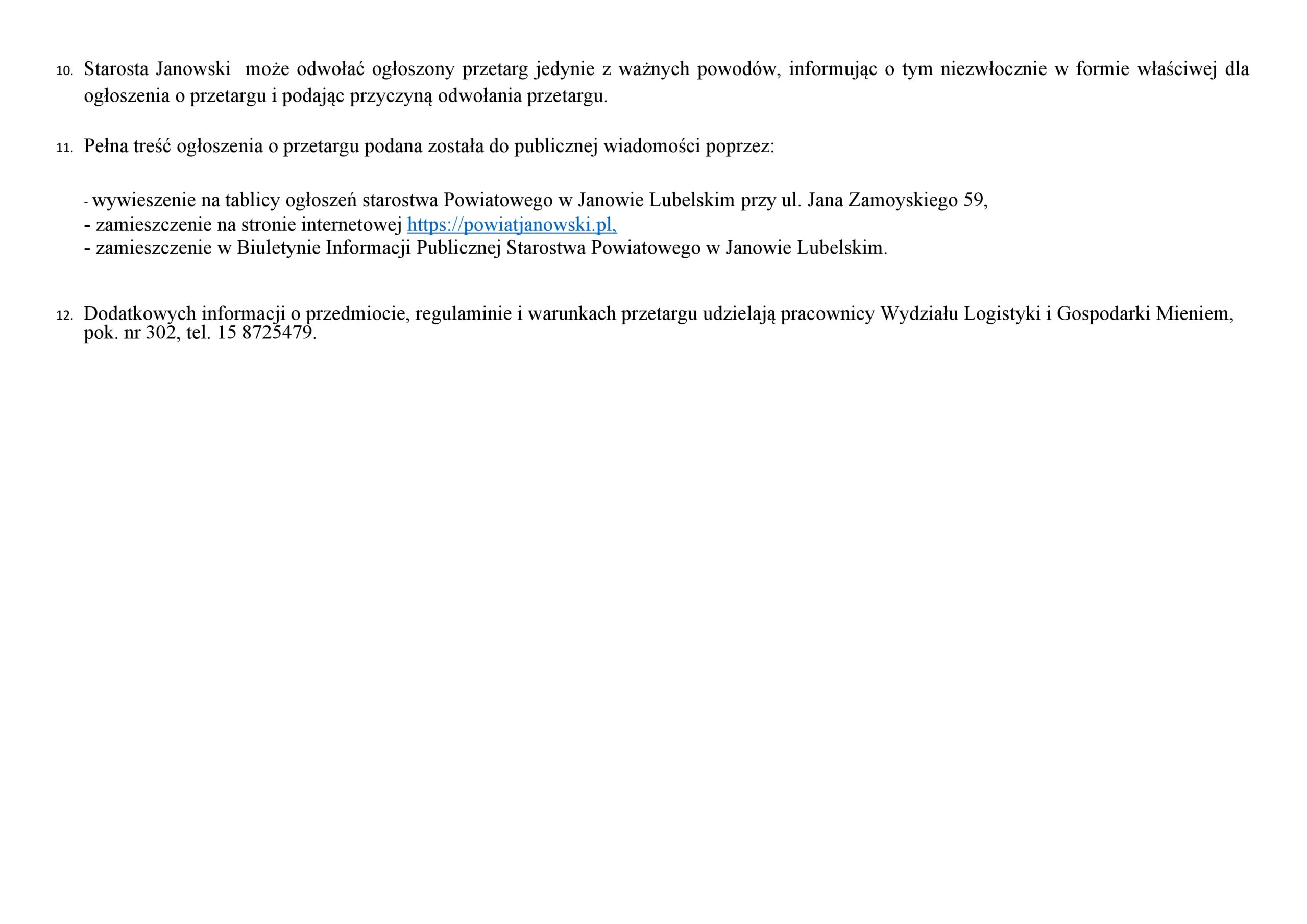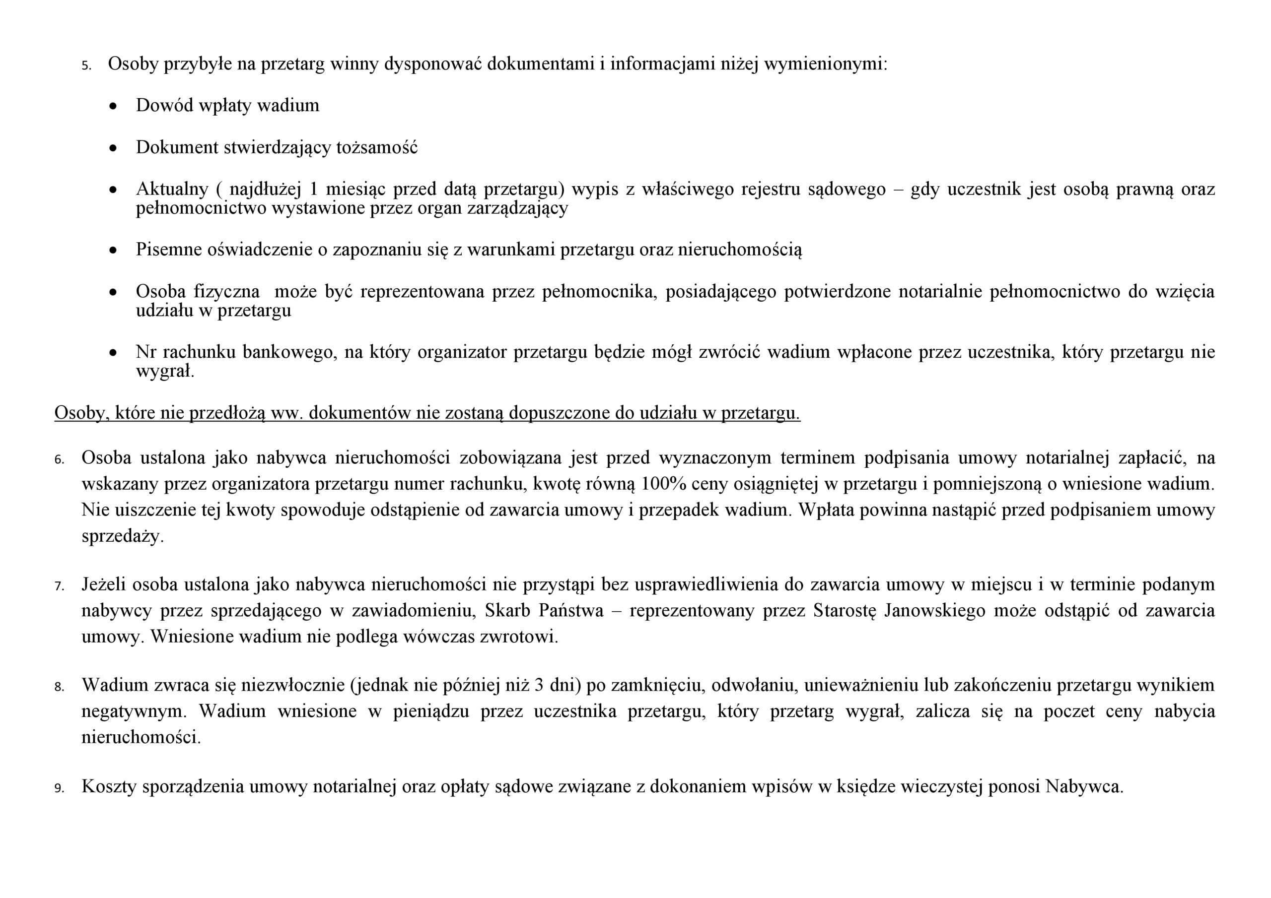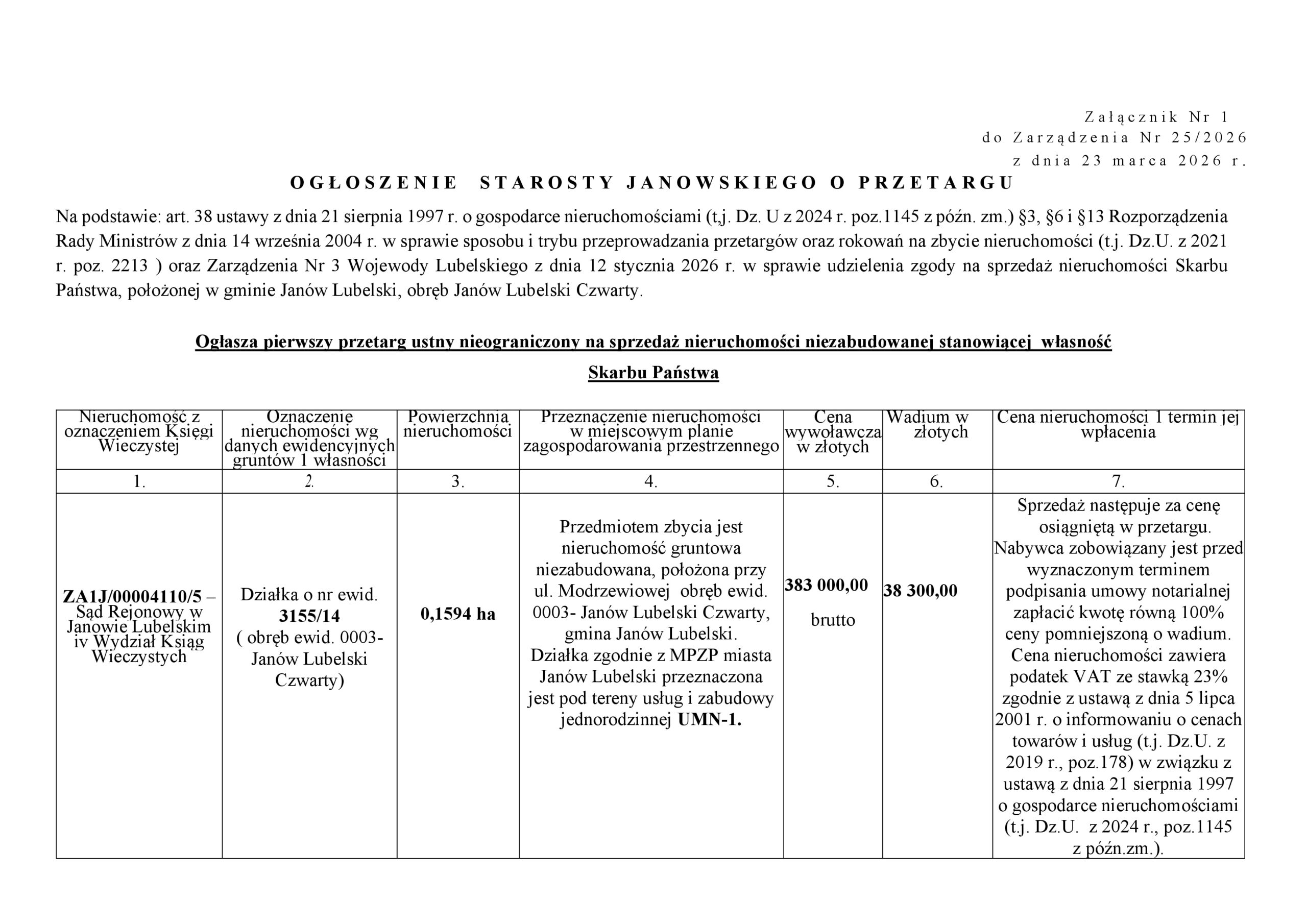 Ogłoszenie Starosty Janowskiego o pierwszym przetargu ustnym nieograniczonym na sprzedaż nieruchomości niezabudowanej stanowiącej własność Skarbu Państwa