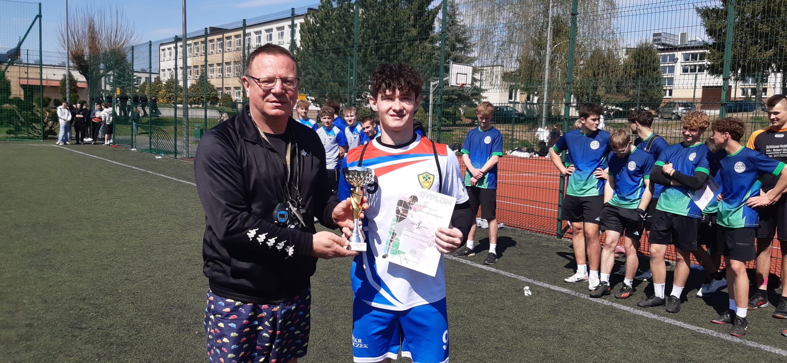 Zdjęcie 3. Kapitan ZS CKR w Potoczku Kacper Kiszka odbiera puchar i dyplom za I m od organizatora zawodów, nauczyciela ZST Zbigniewa Kapronia.