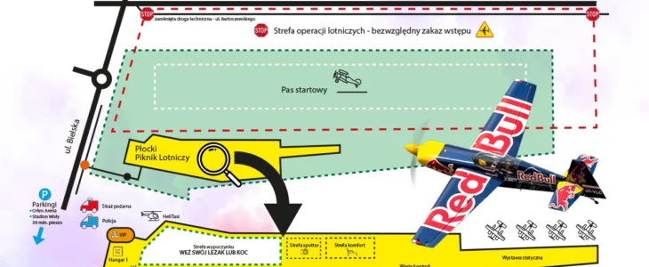 Z uwagi na ograniczoną liczbę miejsc parkingowych zalecamy dojazd komunikacją miejską lub rowerami. Płock ma bardzo dobrze rozbudowaną sieć dróg rowerowych, jedna z nich przebiega wzdłuż lotniska (ul. Bielska) dlatego z każdego miejsca w Płocku można bezpiecznie dojechać rowerem na wydarzenie. Na lotnisku będzie czekał na Was specjalny rowerowy parking.