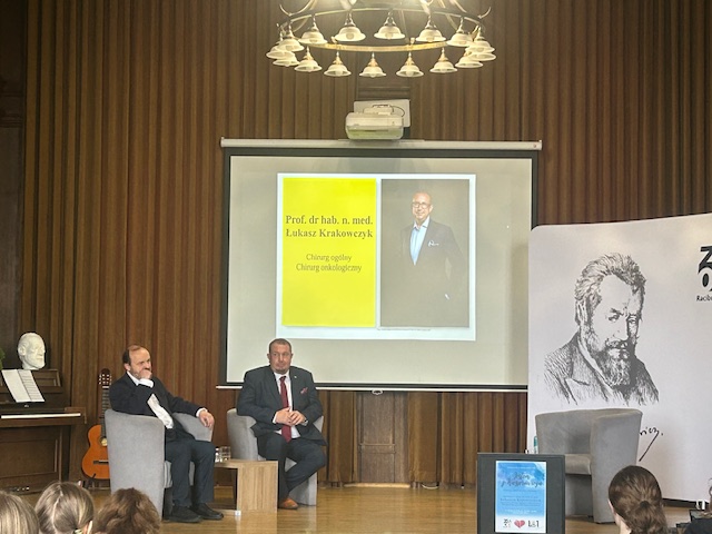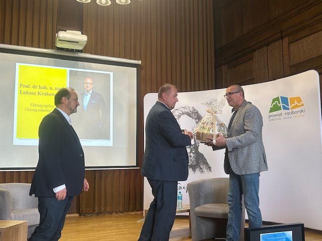 Tym razem gościem spotkania był prof. dr hab. n. med. Łukasz Krakowczyk – wybitny specjalista w dziedzinie chirurgii onkologicznej i rekonstrukcyjnej. Na co dzień zajmuje się leczeniem najbardziej skomplikowanych przypadków chirurgii rekonstrukcyjnej. Swoje doświadczenie zdobywał podczas międzynarodowych staży oraz wieloletniej pracy w renomowanych ośrodkach medycznych w kraju i za granicą. Jak jednak podkreślał podczas spotkania, zawsze z euforią wraca do ‘Kasprowicza” oraz do wspomnień związanych z Raciborzem i swoją szkołą: