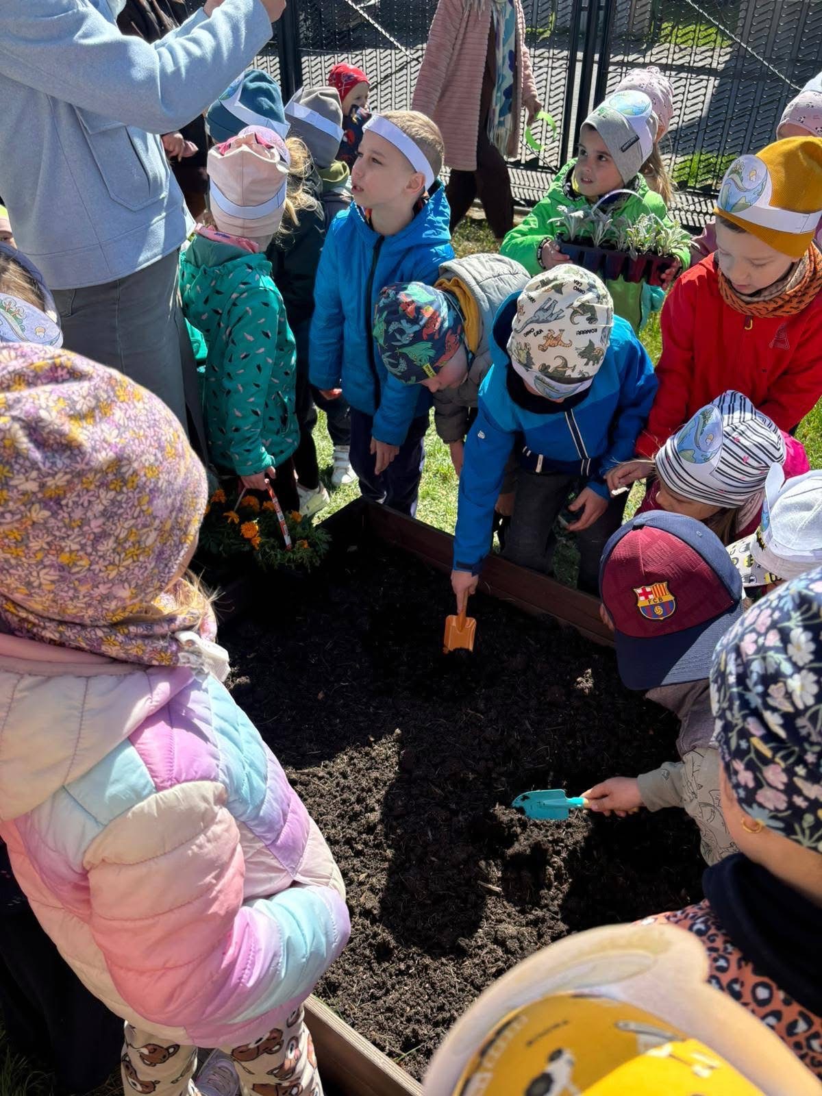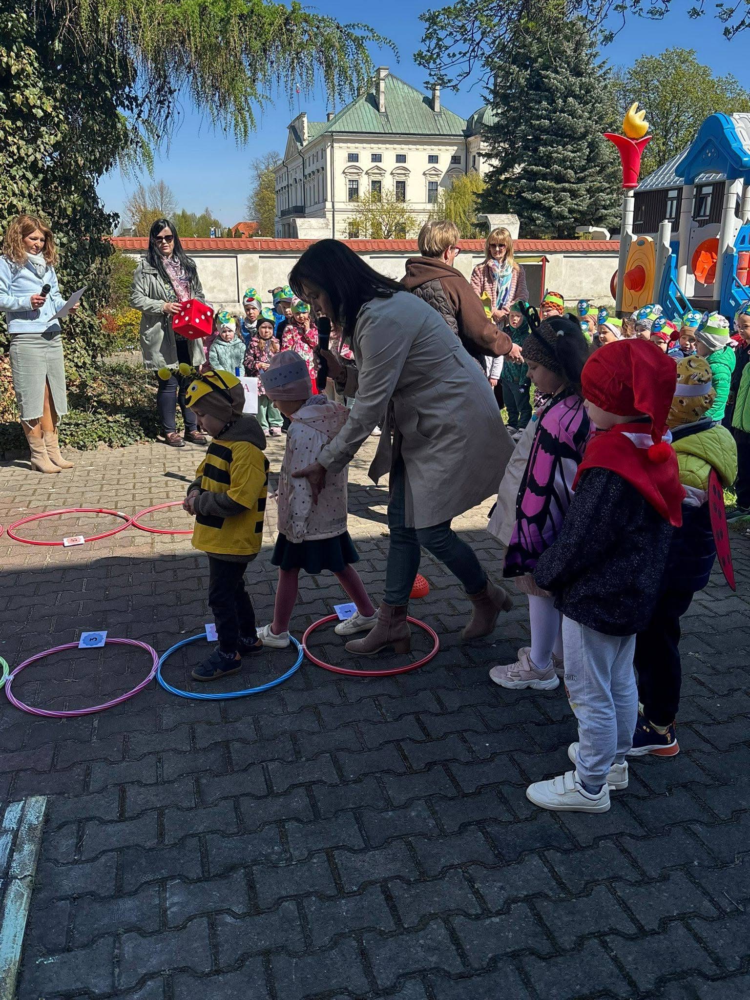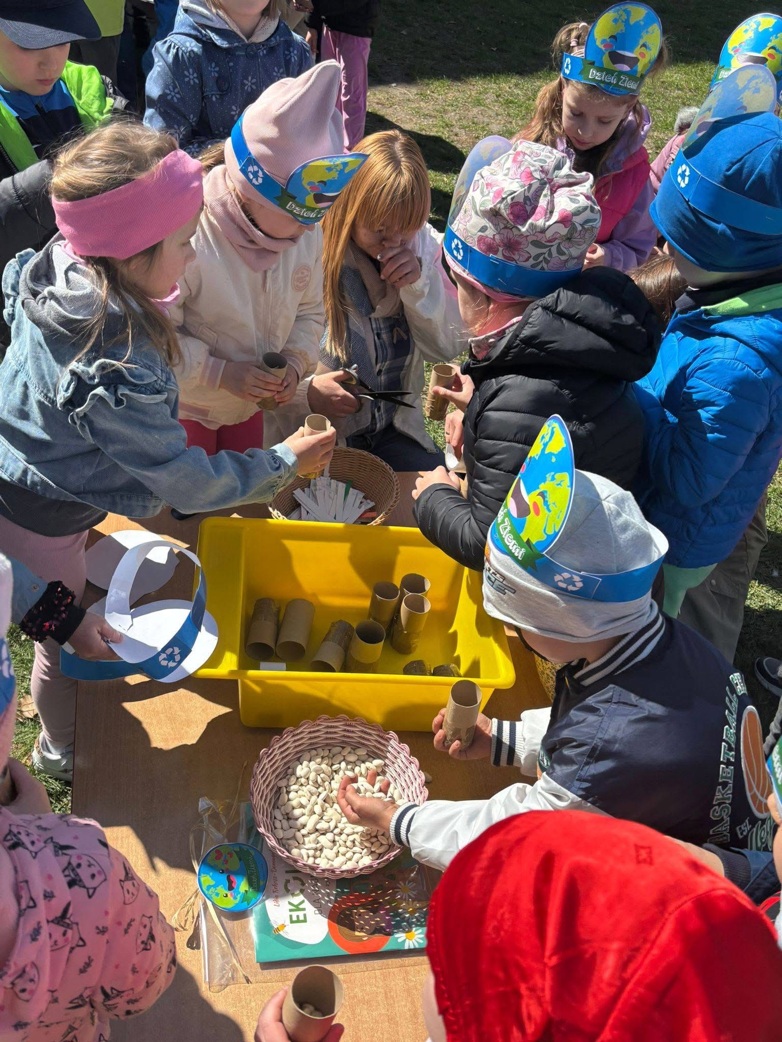 Zabawa na placu zabaw rozpoczęła się od gry „Ściganki”, której towarzyszyły zagadki i zadania ekologiczne. Następnie dzieci przystąpiły do wykonania zadań specjalnych: Pszczółki segregowały śmieci, Kotki malowały gąbeczkami planetę Ziemię, Biedronki malowały kwiatki, Krasnoludki wykonały instrumenty muzyczne zaś Motylki odszyfrowały hasło. Nie zabrakło również wspólnych tańców, a na zakończenie jak przystało na Dzień Ziemi dzieci zasiały nasze ogródeczki warzywkami i kwiatkami.