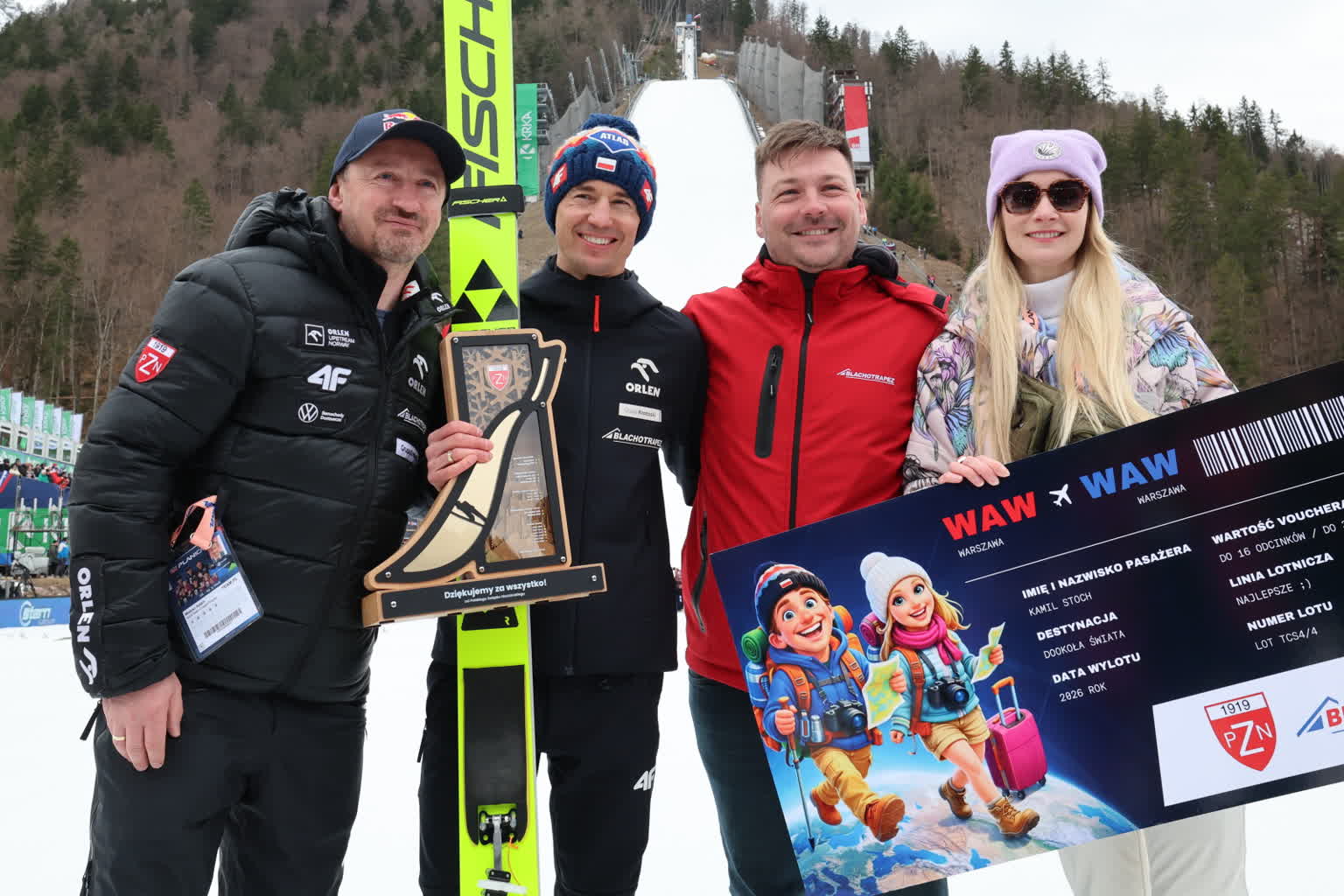 Prezes Polskiego Związku Narciarskiego Adam Małysz, wielki poprzednik Stocha, wręczył mu nagrodę ufundowaną przez PZN i jednego ze sponsorów – „Bilet na podróż dookoła świata”, składający się z 16 destynacji, dla Kamila i jego żony Ewy.