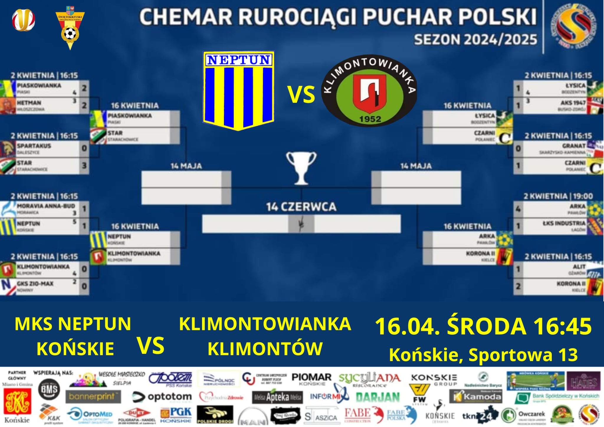 Już w najbliższą środę, 16 kwietnia o godzinie 16:45, stadion przy ul. Sportowej 13 w Końskich stanie się areną ćwierćfinałowej rywalizacji w ramach Chemar Rurociągi Pucharu Polski. Miejscowy Neptun Końskie podejmie ekipę Klimontowianki Klimontów w walce o awans do półfinału regionalnych rozgrywek.