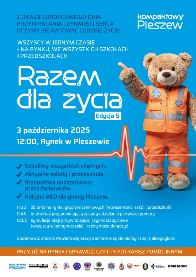 Wyobraź sobie, iż ktoś obok Ciebie nagle traci przytomność. Liczą się sekundy, a Ty możesz być jedyną osobą, która da mu szansę na życie. Przećwiczyć Resuscytację Krążeniowo-Oddechową może każdy kto w najbliższy piątek przed godziną 12.00 przybędzie na pleszewski Rynek, gdzie odbywać się będzie 5. edycja akcji „Razem dla Życia”, organizowana z okazji Europejskiego Dnia Przywracania Czynności Serca. Na Rynku powstaną specjalne stanowiska prowadzone przez wykwalifikowanych instruktorów, którzy pokażą, iż pierwsza pomoc to nie wiedza zarezerwowana dla specjalistów, ale umiejętność dostępna każdemu. Wydarzenie rozpocznie się zbiórką grup ćwiczeniowych z pleszewskich szkół i przedszkoli o godz. 11:30, następnie przewidziano krótki instruktaż a punktualnie o 12:00 wszyscy razem rozpoczną symulację akcji przywracającej czynności życiowe. W tym samym czasie symulacje odbywać się będą w szkołach i przedszkolach MiG Pleszew. Ale każdy może przyjść na Rynek i poćwiczyć na manekinach. W piątek na Rynku kolejne defibrylatory AED, trafią do przedstawicieli lokalnych społeczności a potem do przestrzeni publicznej i zwiększą poziom bezpieczeństwa mieszkańców. Akcja realizowana jest z inicjatywy Miasta i Gminy Pleszew przy współpracy z placówkami oświatowymi i wsparciu licznych partnerów.