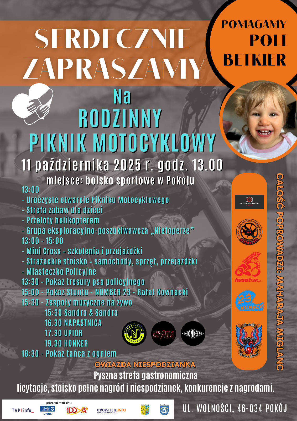 W sobotę (11 października) o godz. 13.00 zapraszamy na Rodzinny Piknik Motocyklowy w Pokoju. Czeka mnóstwo atrakcji dla całych rodzin. Dochód z wydarzenia zostanie przeznaczony na pomoc Poli Betkier.