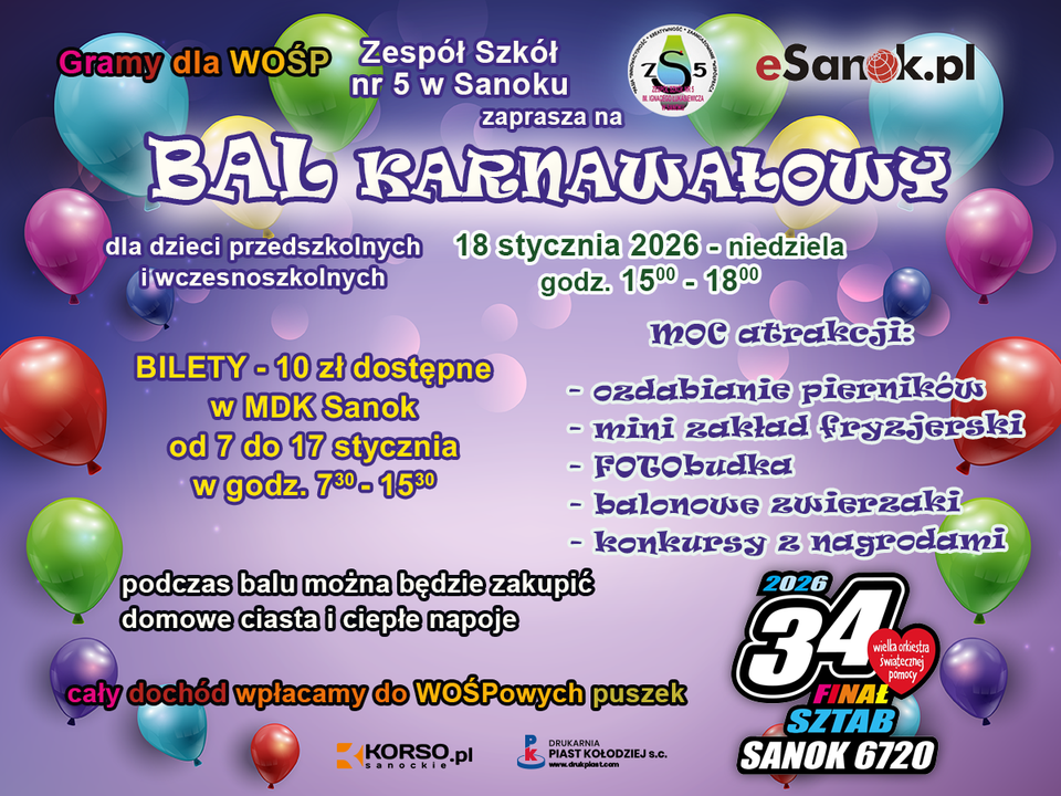 Już w niedzielę, 18 stycznia 2026 roku, Sanok zamieni się w kolorową, karnawałową krainę radości. Zespół Szkół nr 5 w Sanoku, zaprasza na Bal Karnawałowy dla dzieci przedszkolnych i wczesnoszkolnych, organizowany w ramach akcji „Gramy dla WOŚP”.