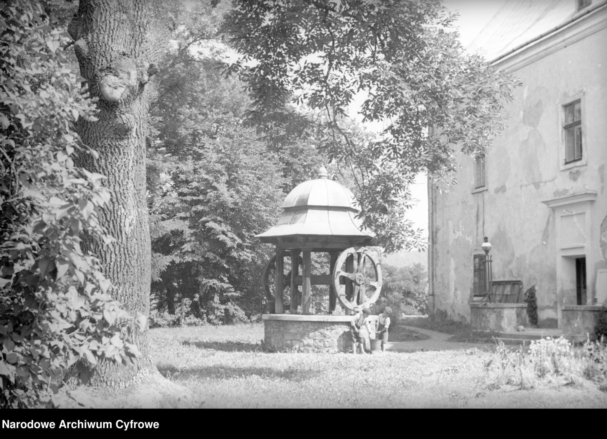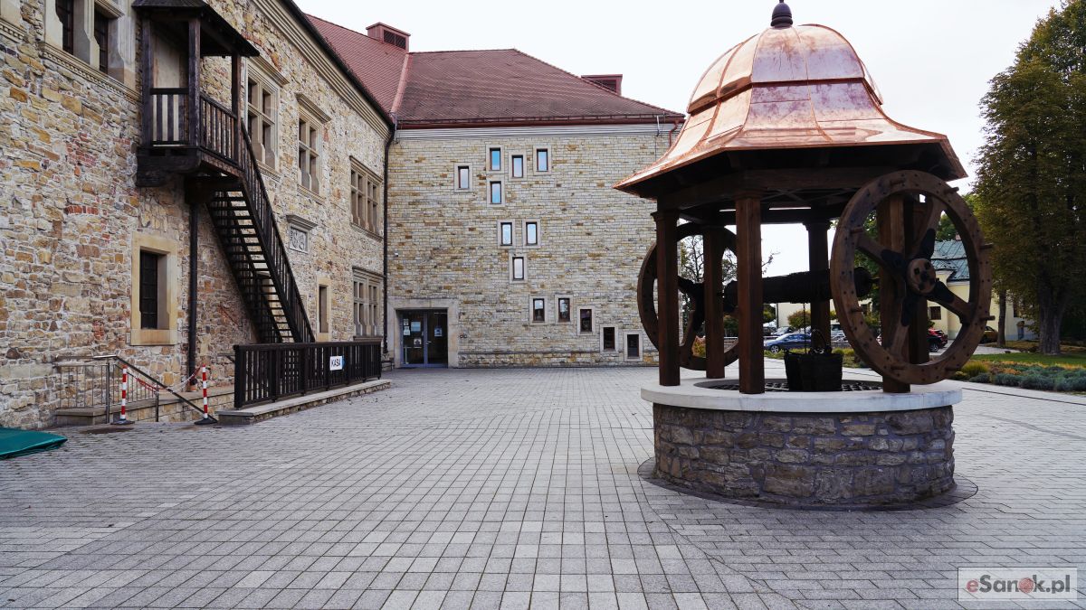 Studnia na dziedzińcu sanockiego zamku, lata 30. XX w. Fot. Henryk Poddębski. Źródło: NAC, domena publiczna.[/caption]
