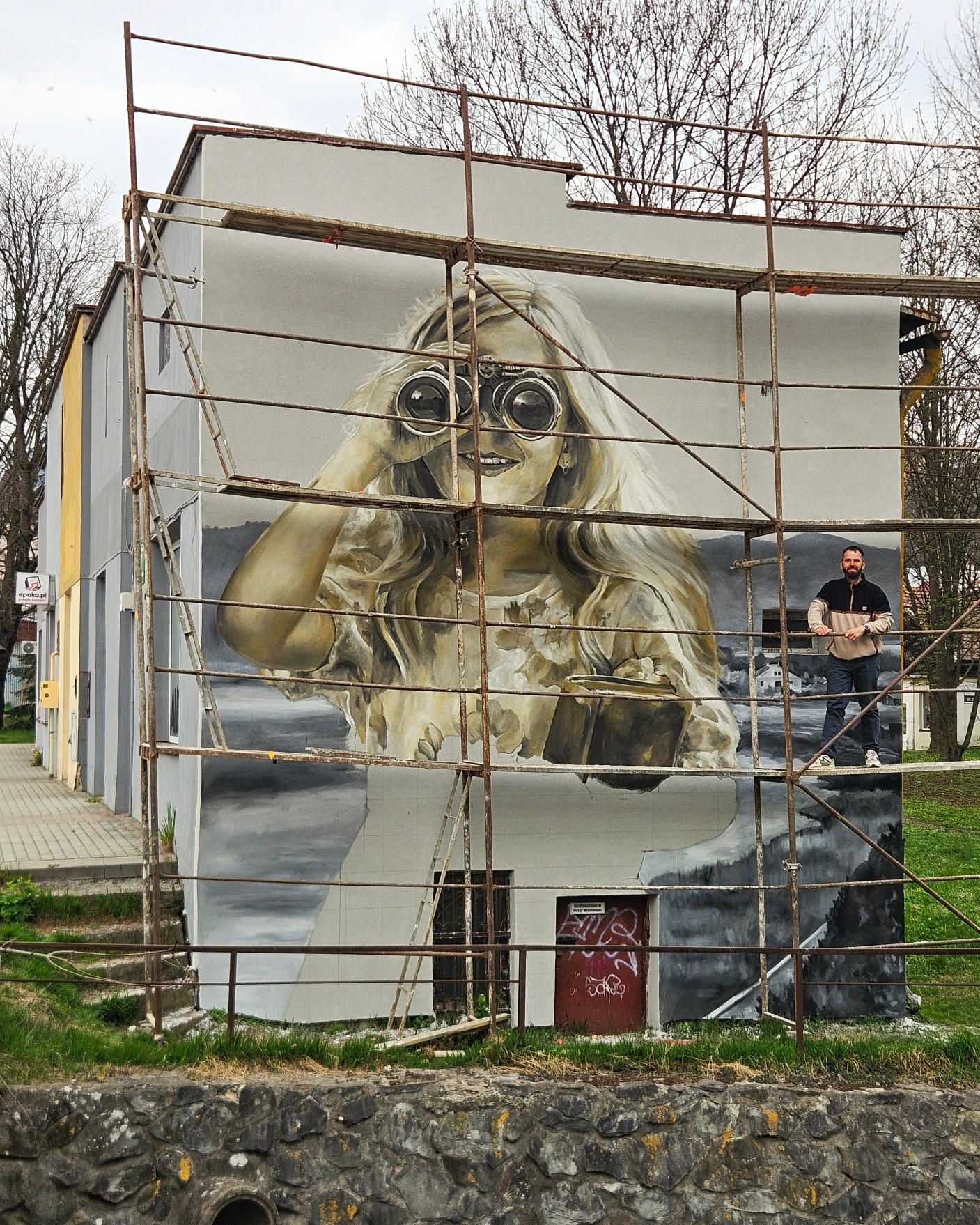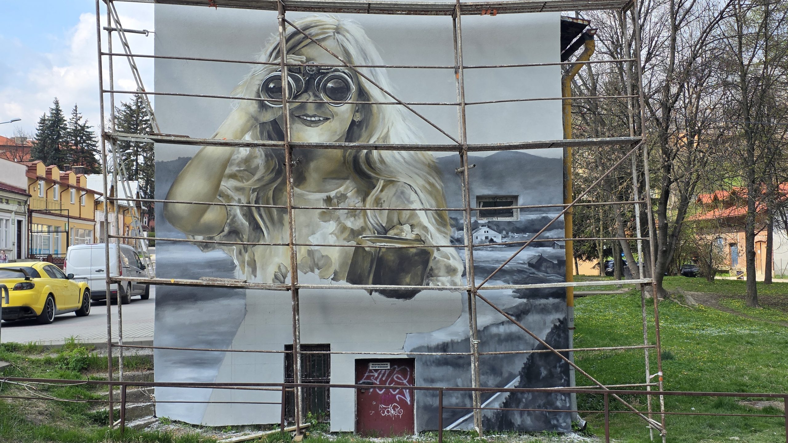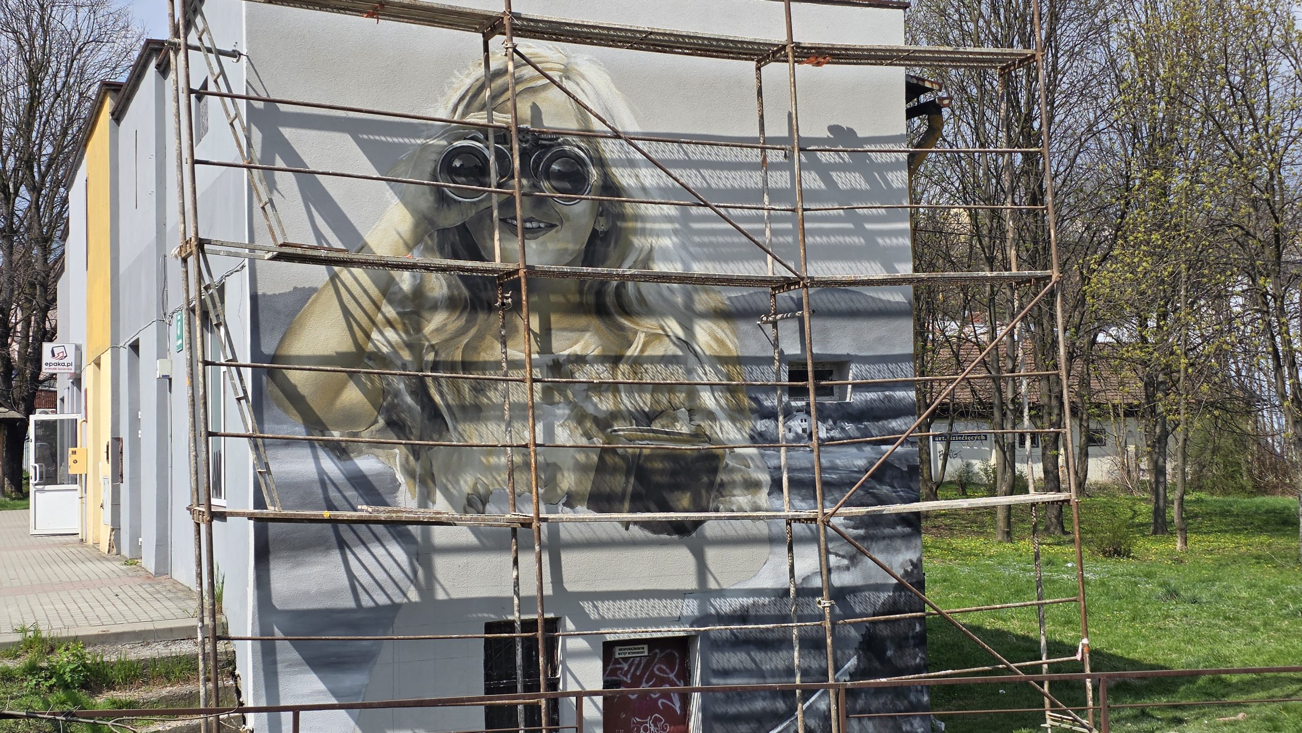 Mieszkańcy Sanoka z zaciekawieniem przyglądają się pracom prowadzonym przy ulicy Lipińskiego. Na ścianie budynku, w którym na co dzień tworzy Arkadiusz Andrejkow, powstało imponujące dzieło przedstawiające postać patrzącą przez lornetkę.