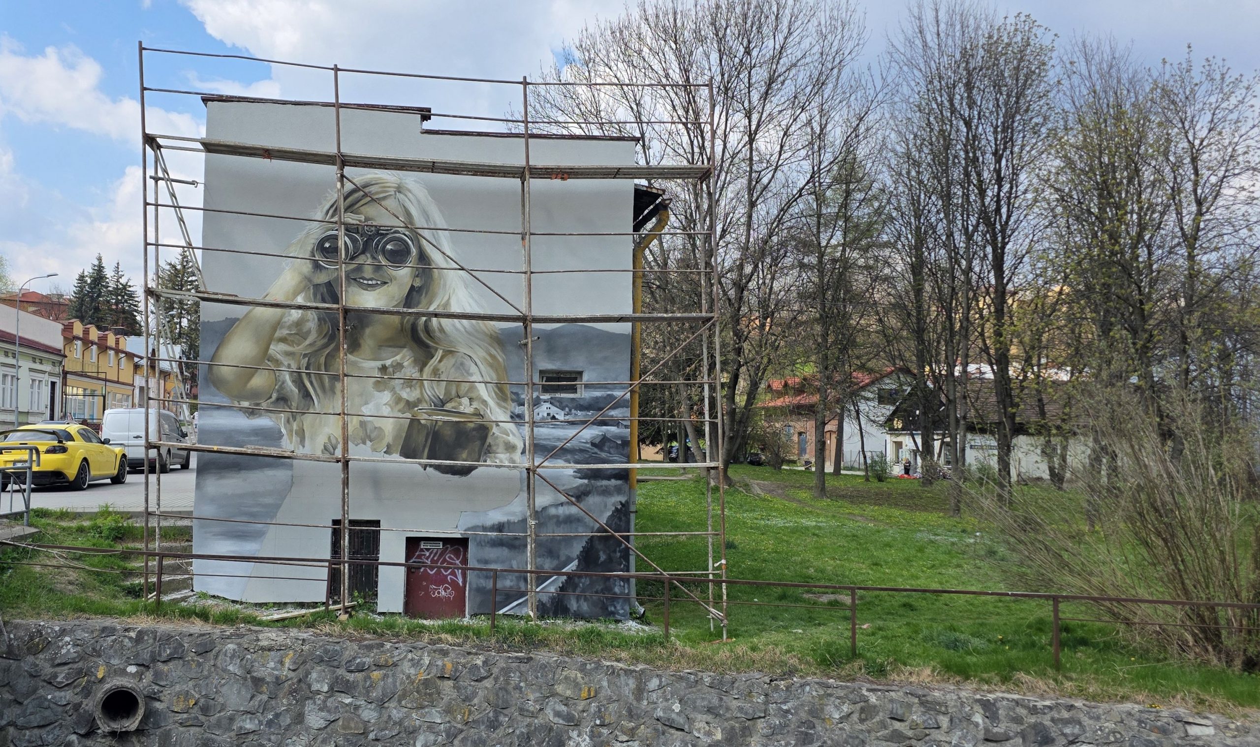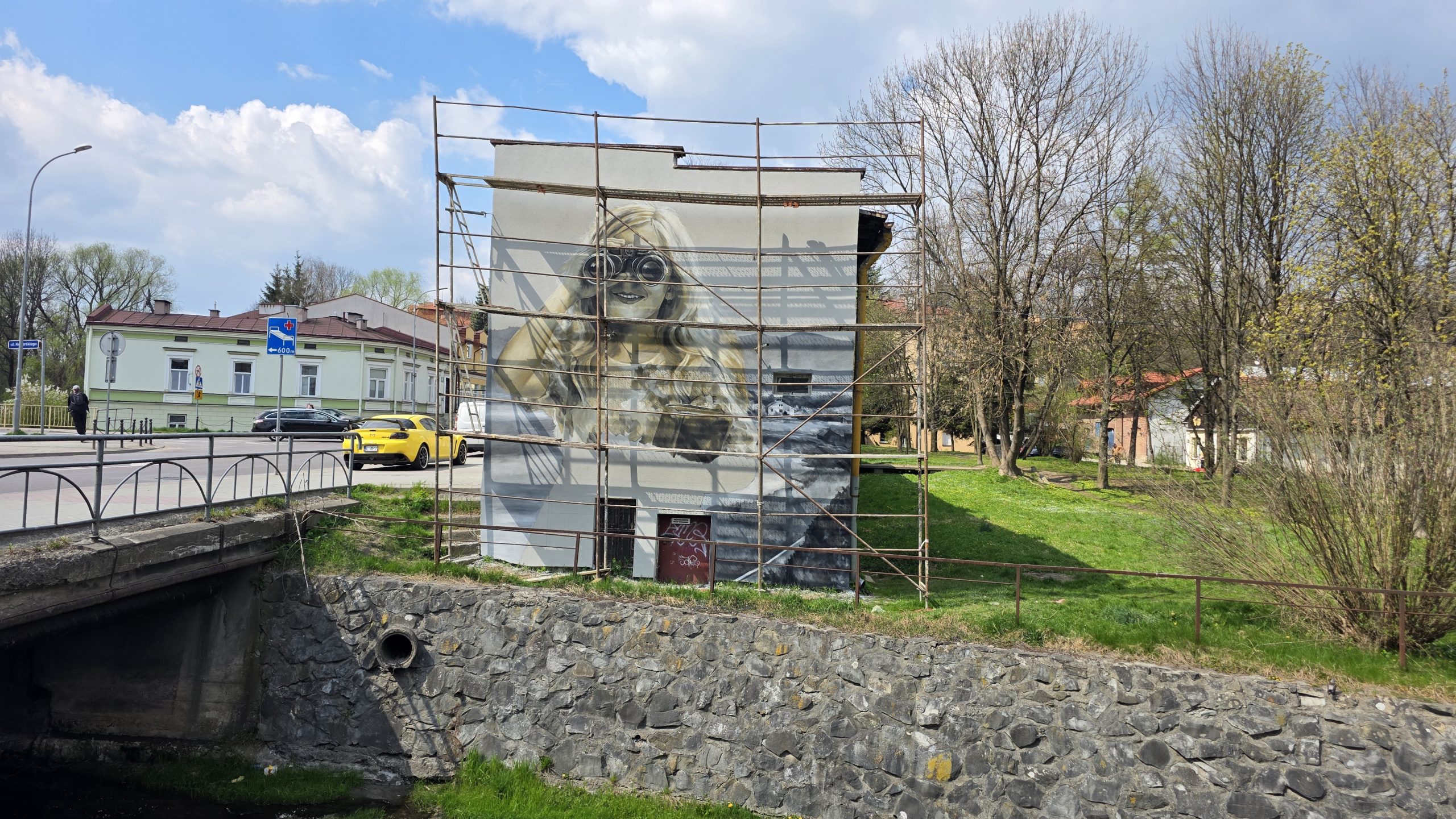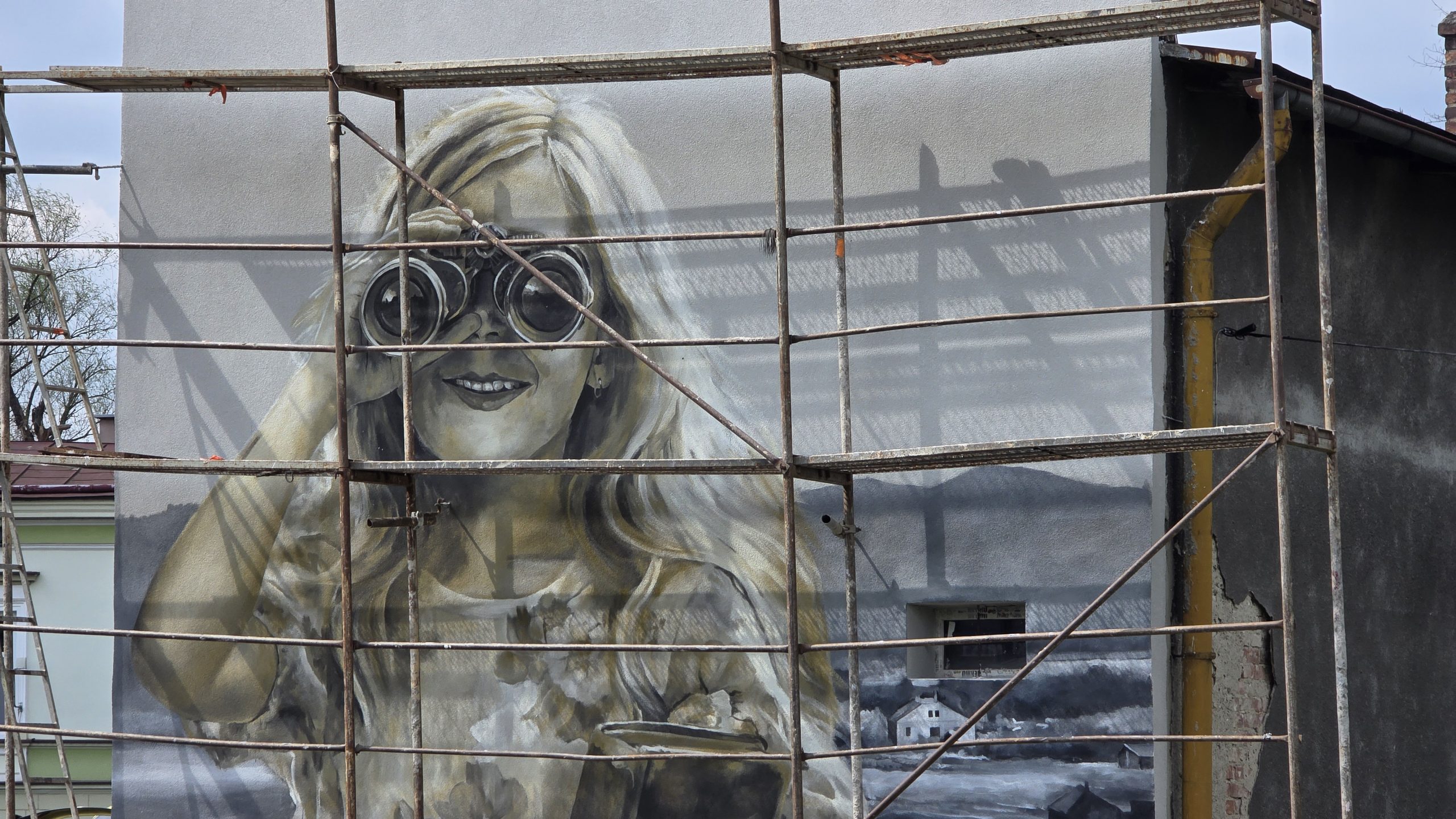 Mieszkańcy Sanoka z zaciekawieniem przyglądają się pracom prowadzonym przy ulicy Lipińskiego. Na ścianie budynku, w którym na co dzień tworzy Arkadiusz Andrejkow, powstało imponujące dzieło przedstawiające postać patrzącą przez lornetkę.