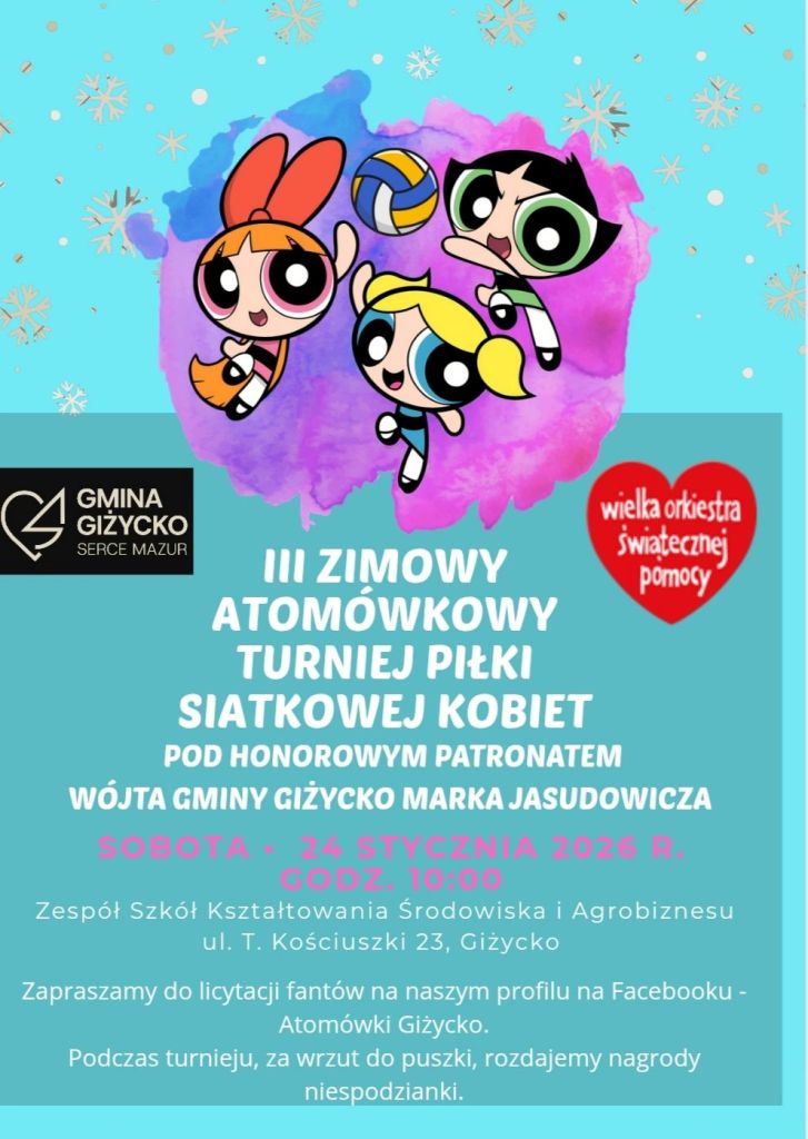 Już w najbliższą sobotę, 24 stycznia, w Giżycku odbędzie się III Zimowy Atomówkowy Turniej Piłki Siatkowej Kobiet, który połączy sportową rywalizację z ideą pomagania. Wydarzenie zostanie rozegrane pod honorowym patronatem Wójta Gminy Giżycko Marka Jasudowicza i będzie częścią działań wspierających Wielką Orkiestrę Świątecznej Pomocy.