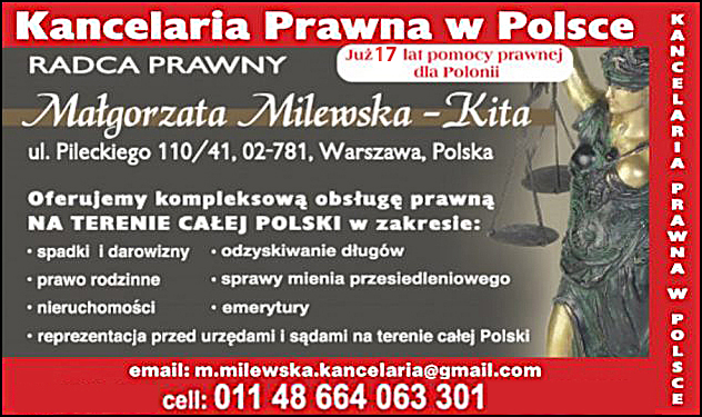 Autorem jest radca prawny Małgorzata Milewska-Kita z Kancelarii Prawnej w Warszawie. Artykuł ten nie stanowi porady prawnej. Zapraszamy do korzystania z usług Kancelarii tel. +11 48 664 063 301, e-mail: [email protected] Radca prawny Małgorzata Milewska-Kita od ponad 16 lat służy pomocą prawną Polonii kanadyjskiej w sprawach spadkowych, nieruchomości, sądowych i innych na terenie całej Polski.